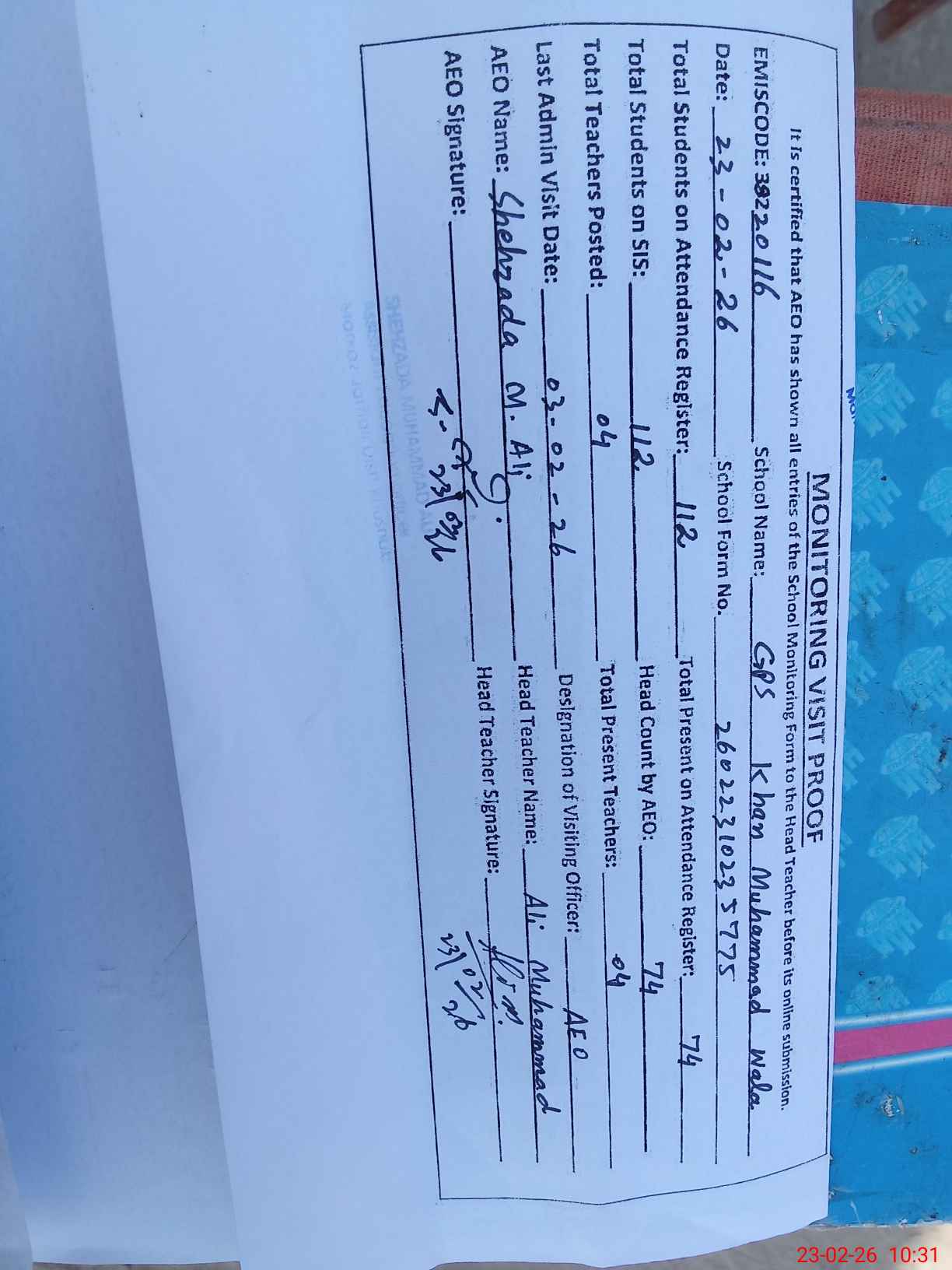 | EMIS Code: 38220116 | Name of School: GPS KHAN MUHAMMAD WALA | |||