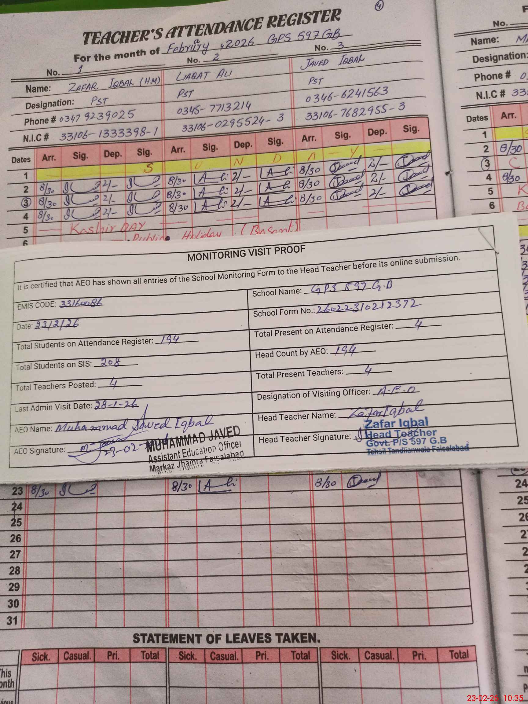 | Attendance Register | Head Teacher | MEA with School | Visit Proof |