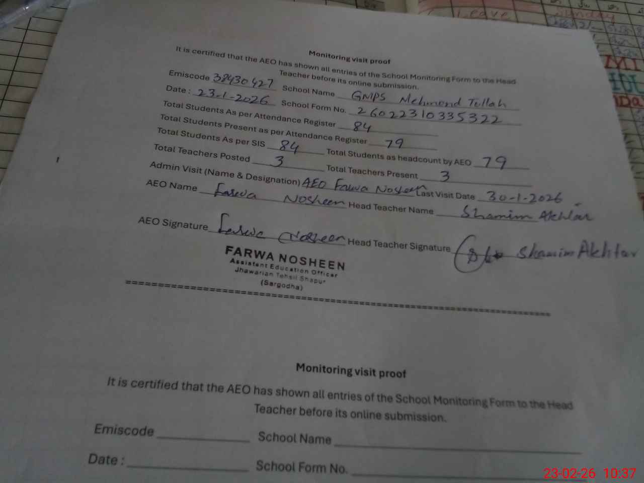 | Attendance Register | Head Teacher | MEA with School | Visit Proof |