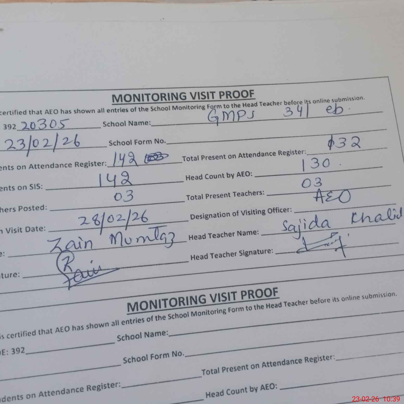| Monitoring Date: 23-02-2026 | Start Time: 23-02-2026 10:02 AM | End Time: 23-02-2026 10:39 AM | Name of MEA: Za**** Mu**** | |