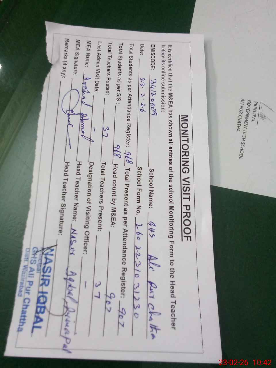 | Attendance Register | Head Teacher | MEA with School | Visit Proof |