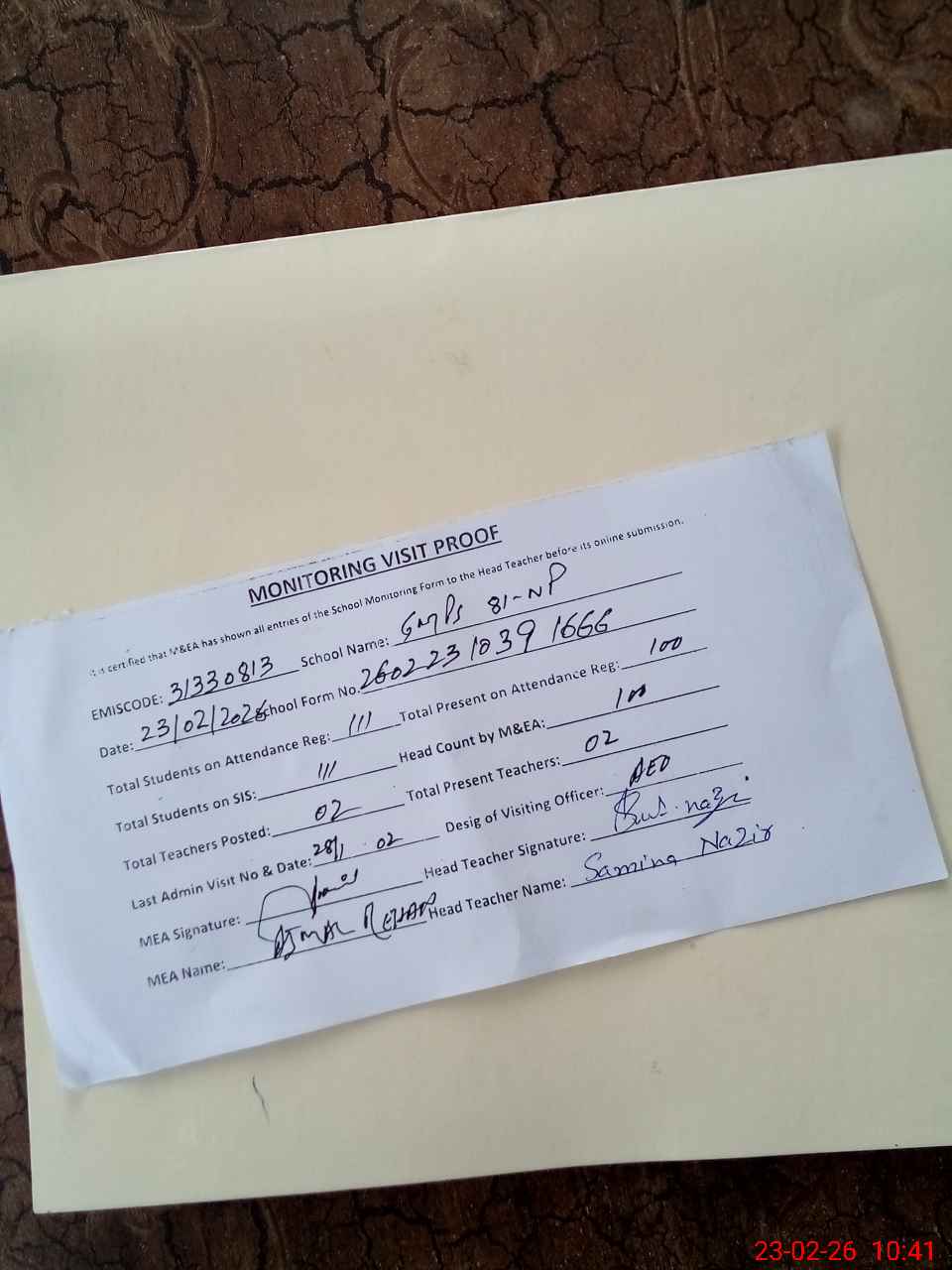 | EMIS Code: 31330813 | Name of School: GMPS CHAK NO. 81/NP | |||