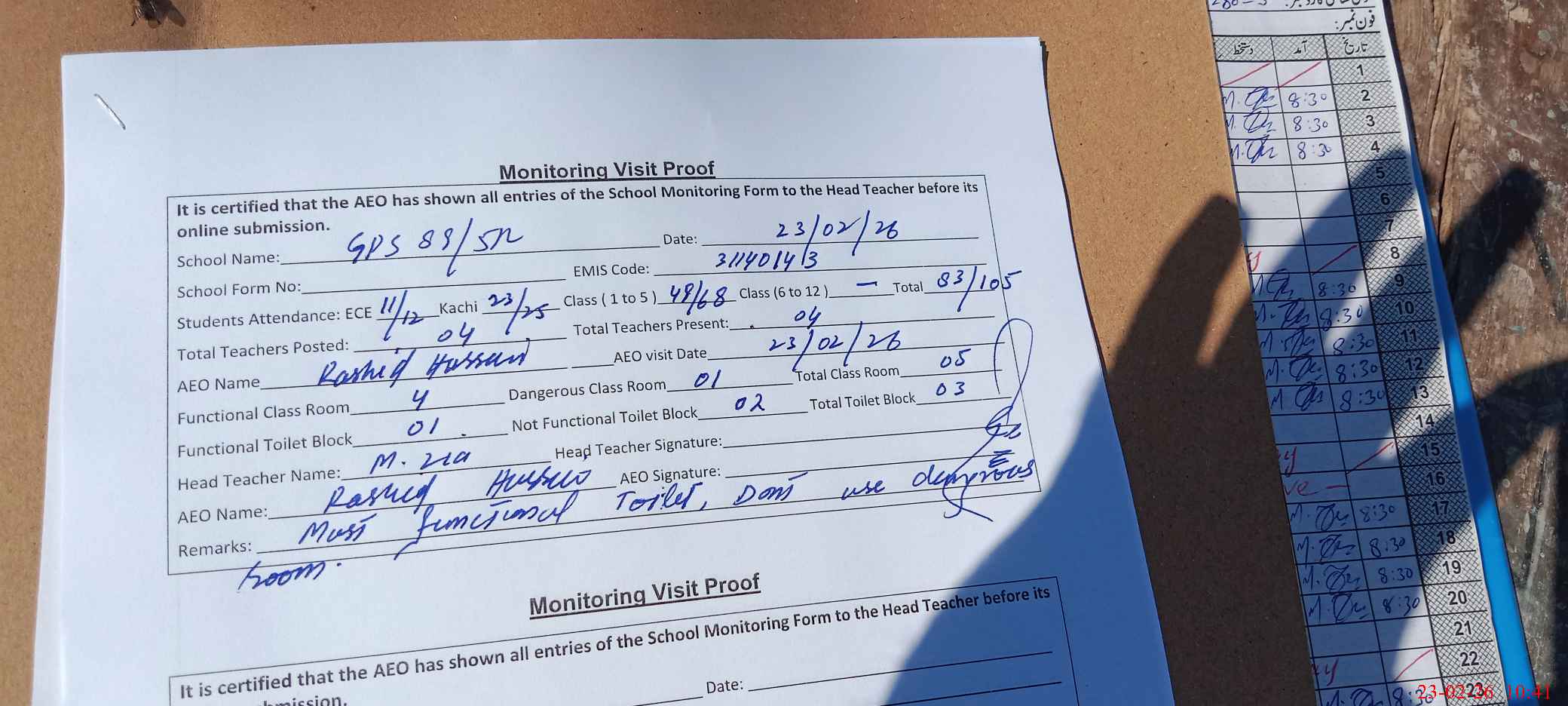 | Attendance Register | Head Teacher | MEA with School | Visit Proof |