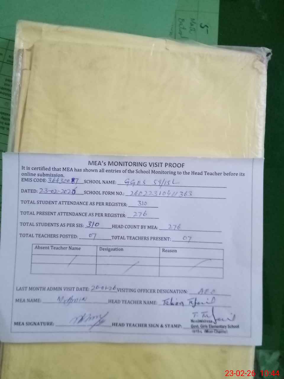 | Attendance Register | Head Teacher | MEA with School | Visit Proof |