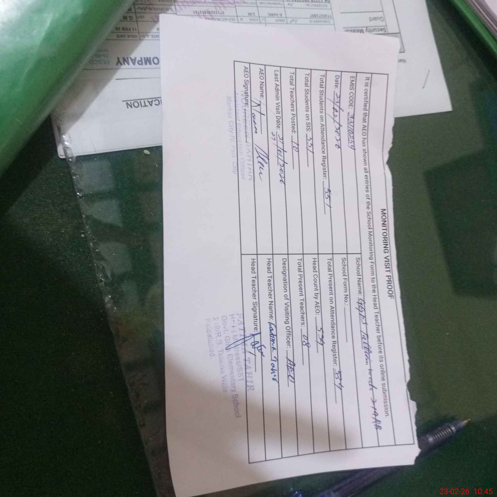 | Attendance Register | Head Teacher | MEA with School | Visit Proof |