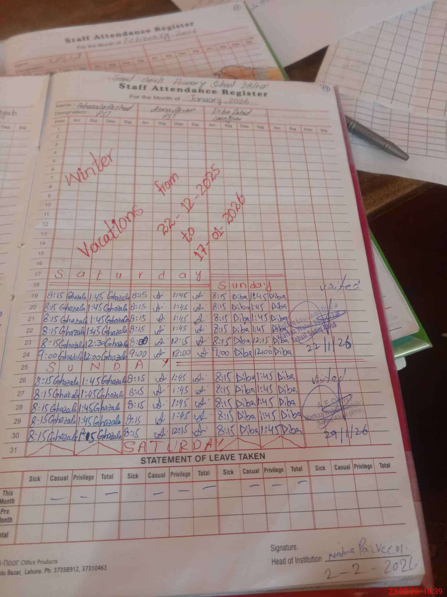 | Attendance Register | Head Teacher | MEA with School | Visit Proof |