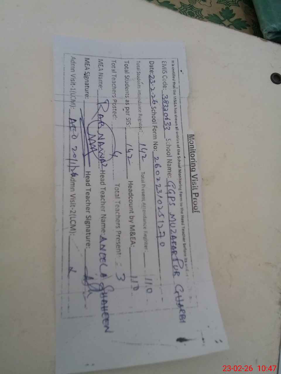 | Attendance Register | Head Teacher | MEA with School | Visit Proof |