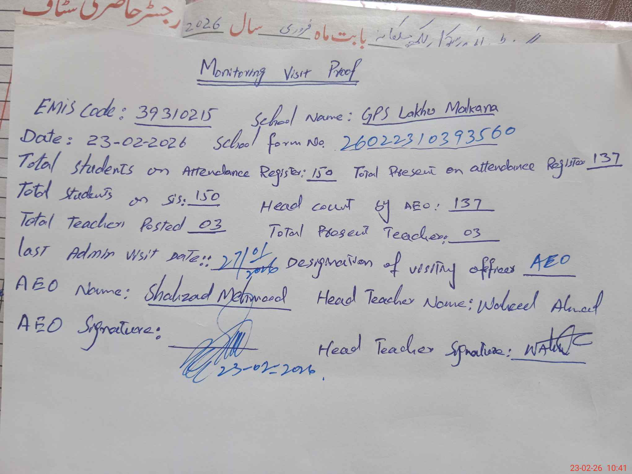 | Attendance Register | Head Teacher | MEA with School | Visit Proof |