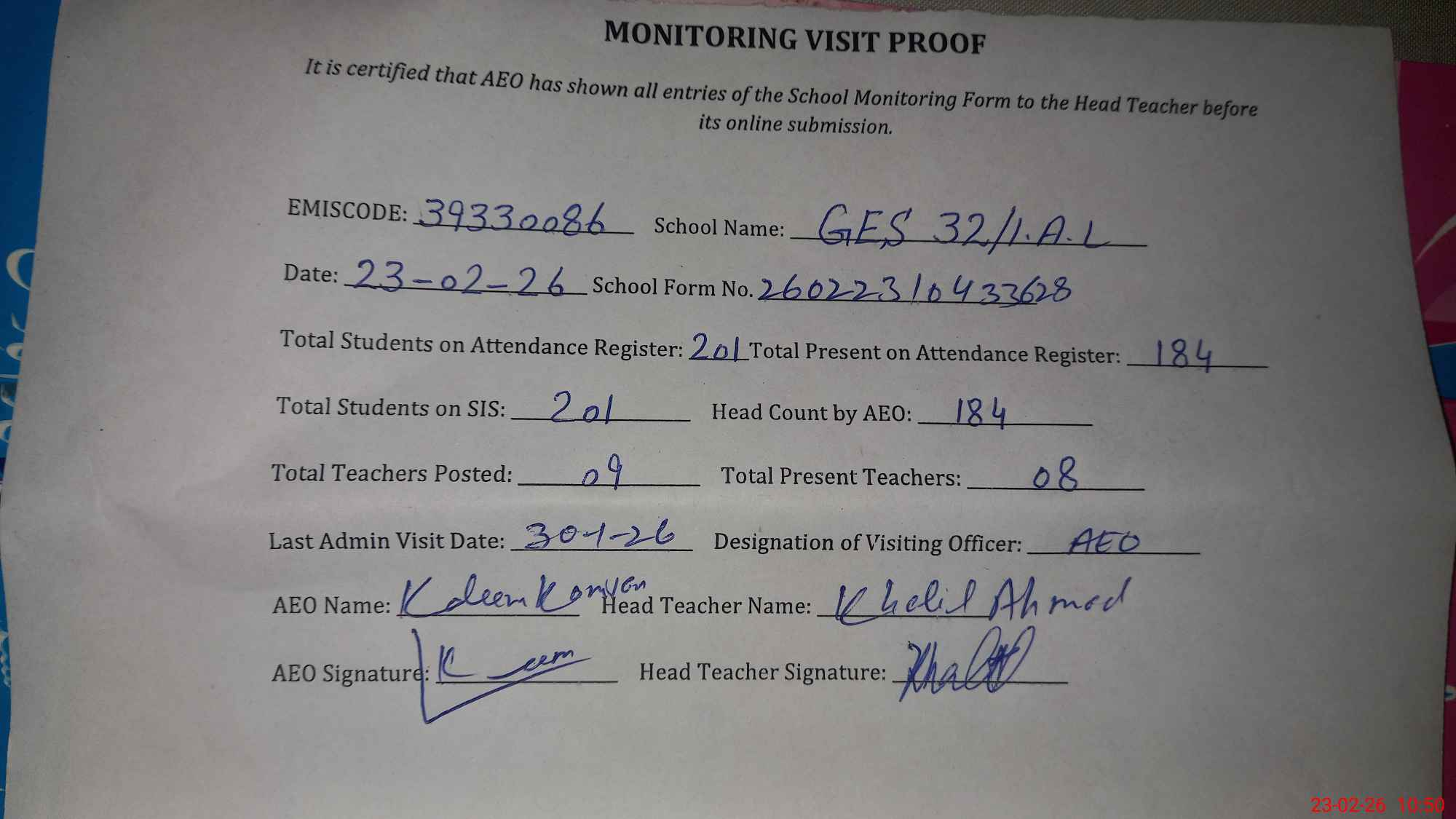 | Attendance Register | Head Teacher | MEA with School | Visit Proof |