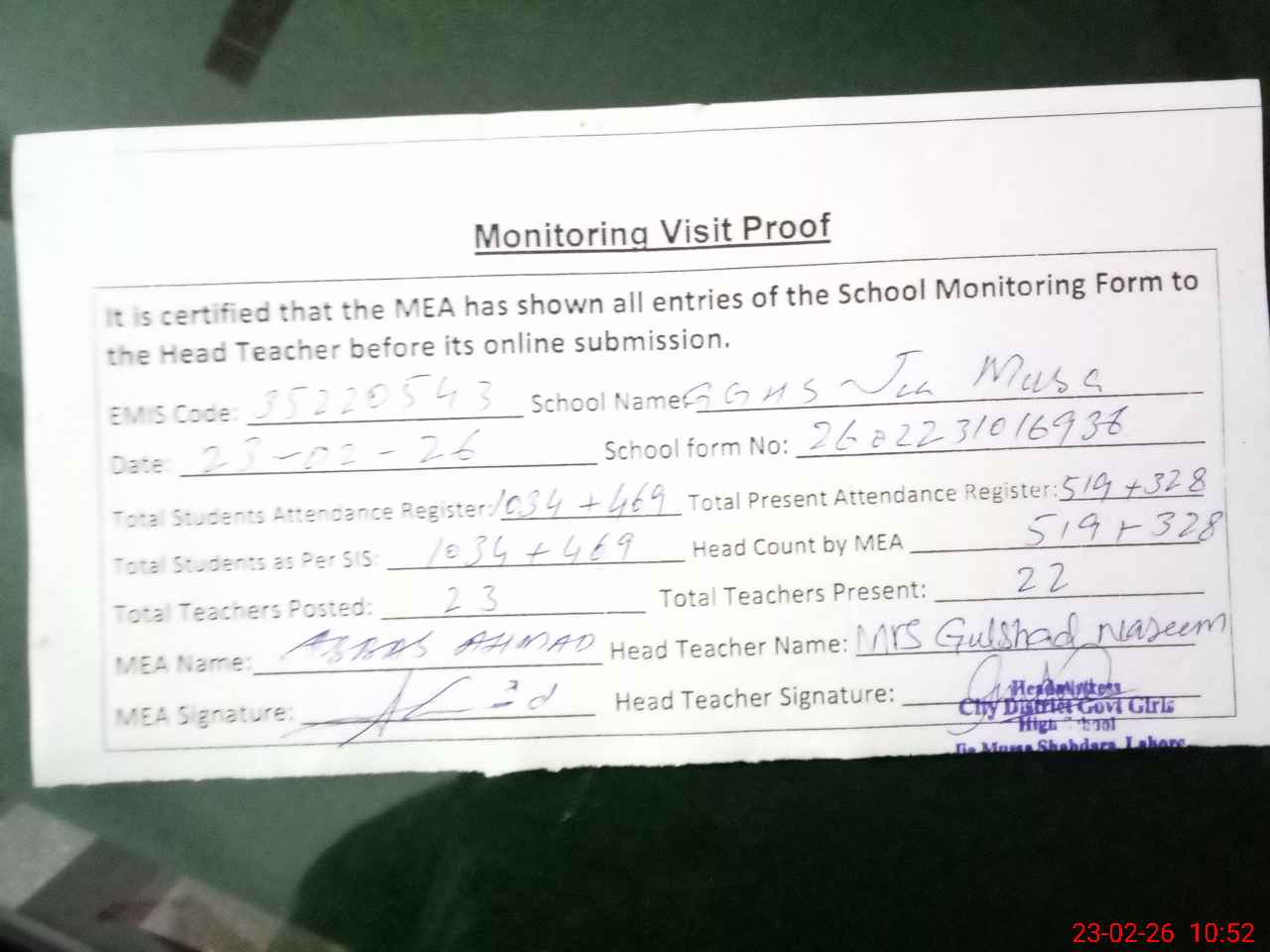 | Attendance Register | Head Teacher | MEA with School | Visit Proof |