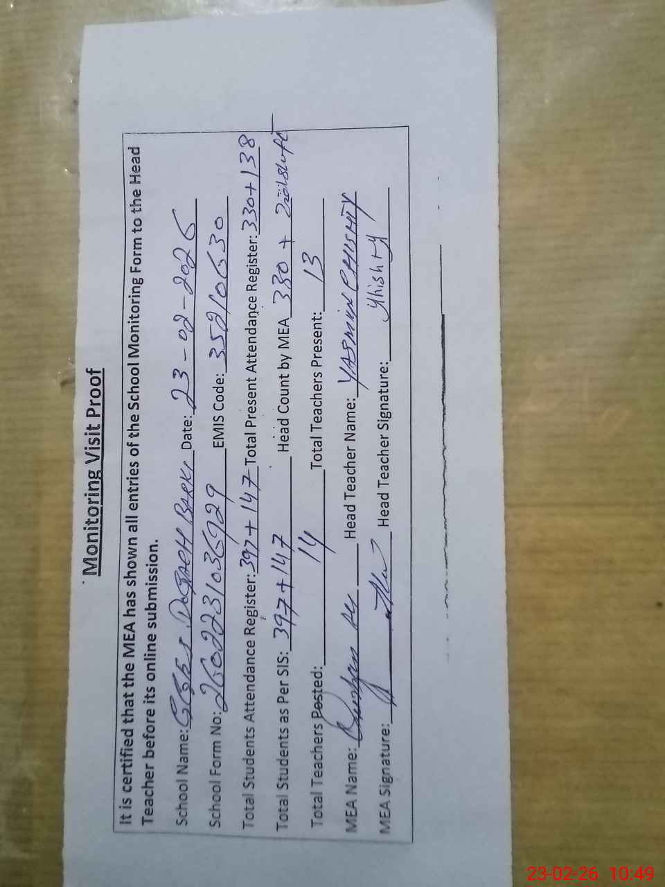 | Remarks (Use Separate Page if Required): latest Administrator visit of the AEO in the school on 09-12-2025. NO Administrator visit of the Dy DEO wef Jaunary 2025 to till today. | |||||