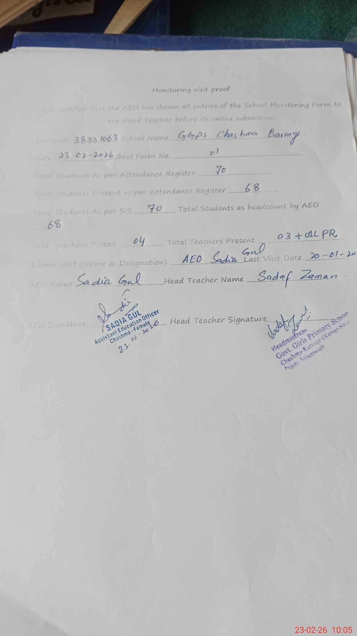 | Attendance Register | Head Teacher | MEA with School | Visit Proof |