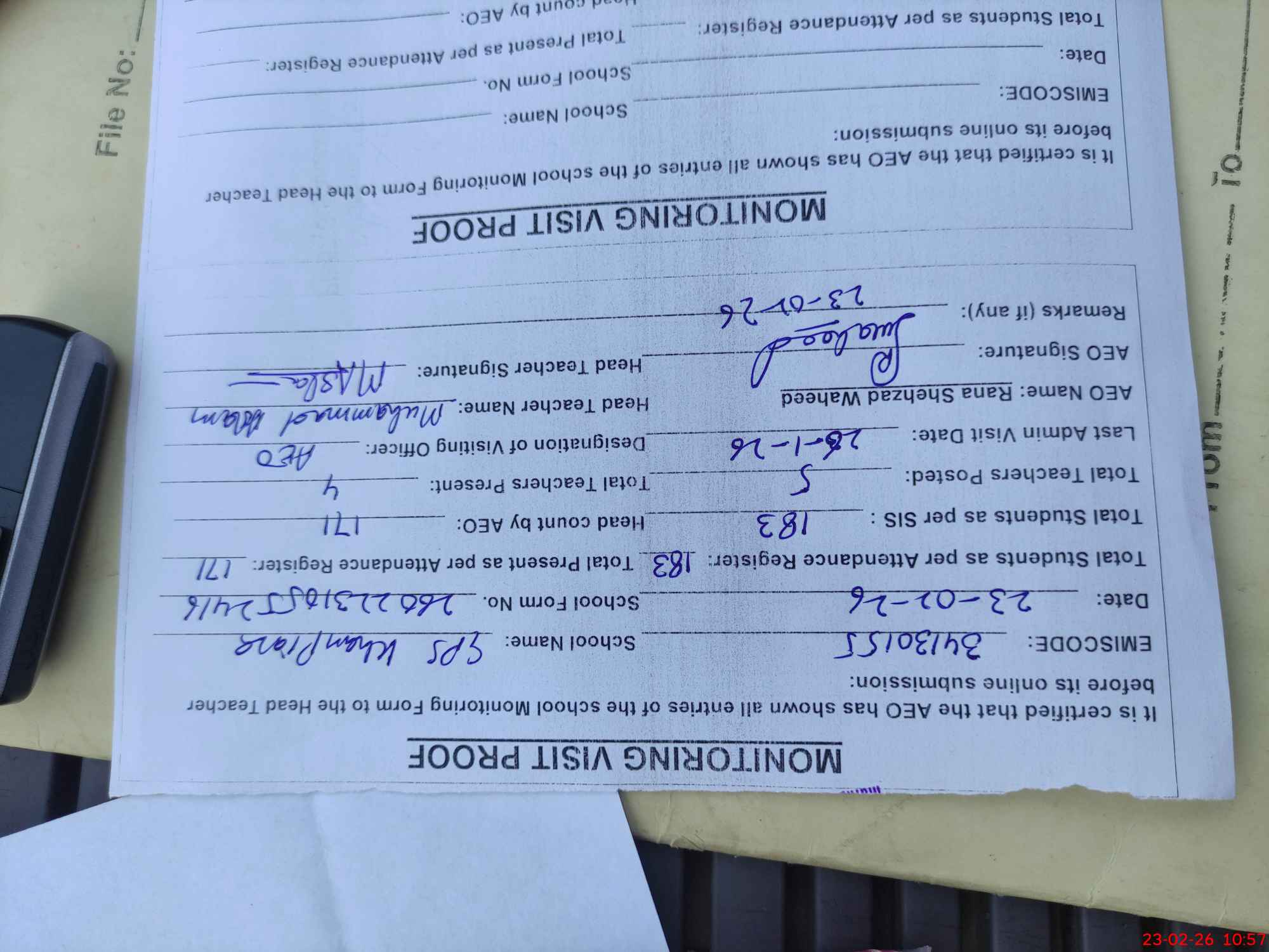 | Attendance Register | Head Teacher | MEA with School | Visit Proof |