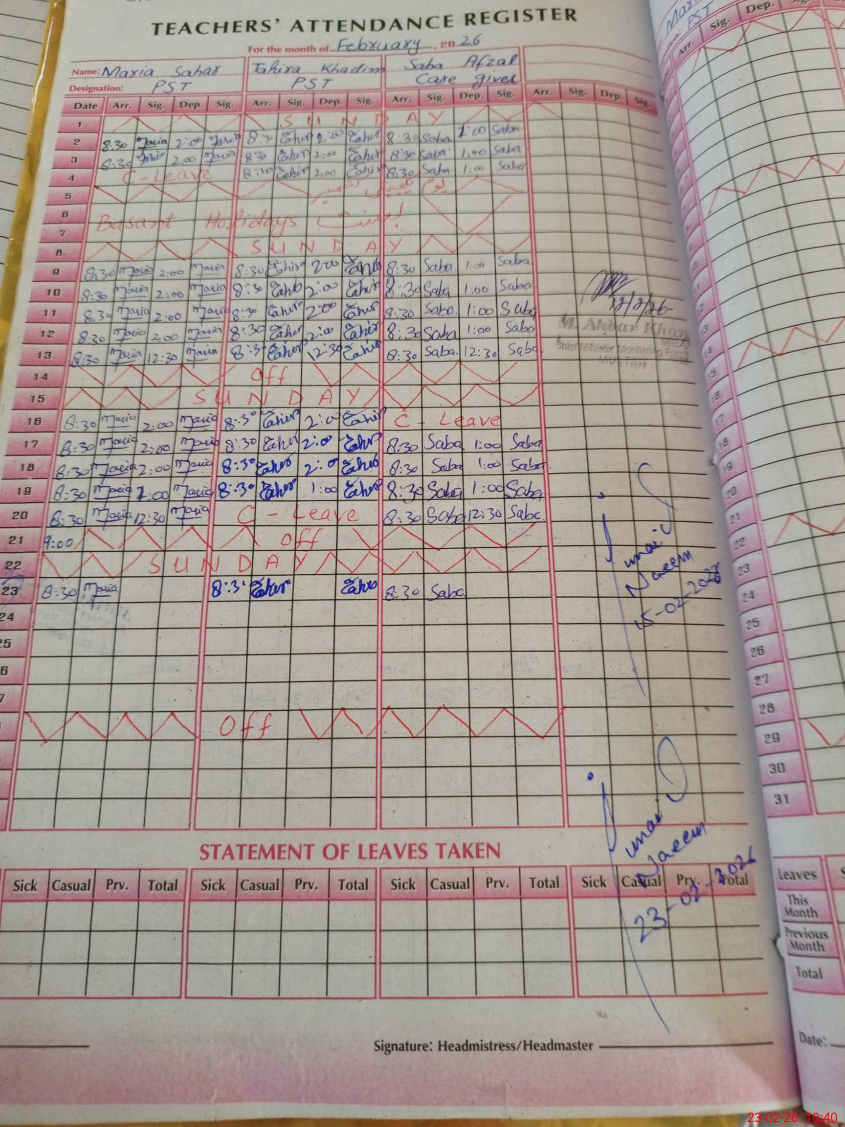 | Attendance Register | Head Teacher | MEA with School | Visit Proof |