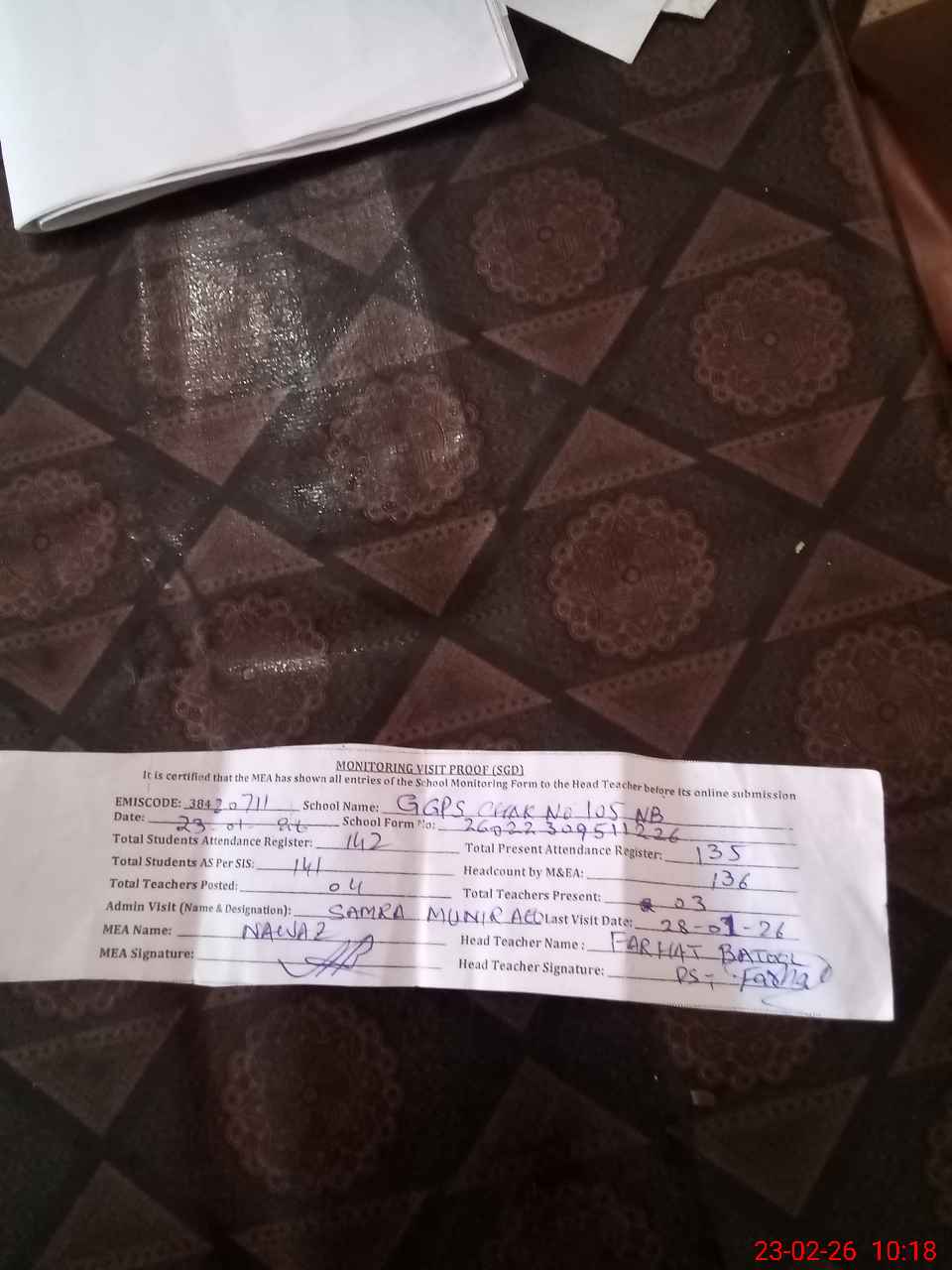 | Attendance Register | Head Teacher | MEA with School | Visit Proof |