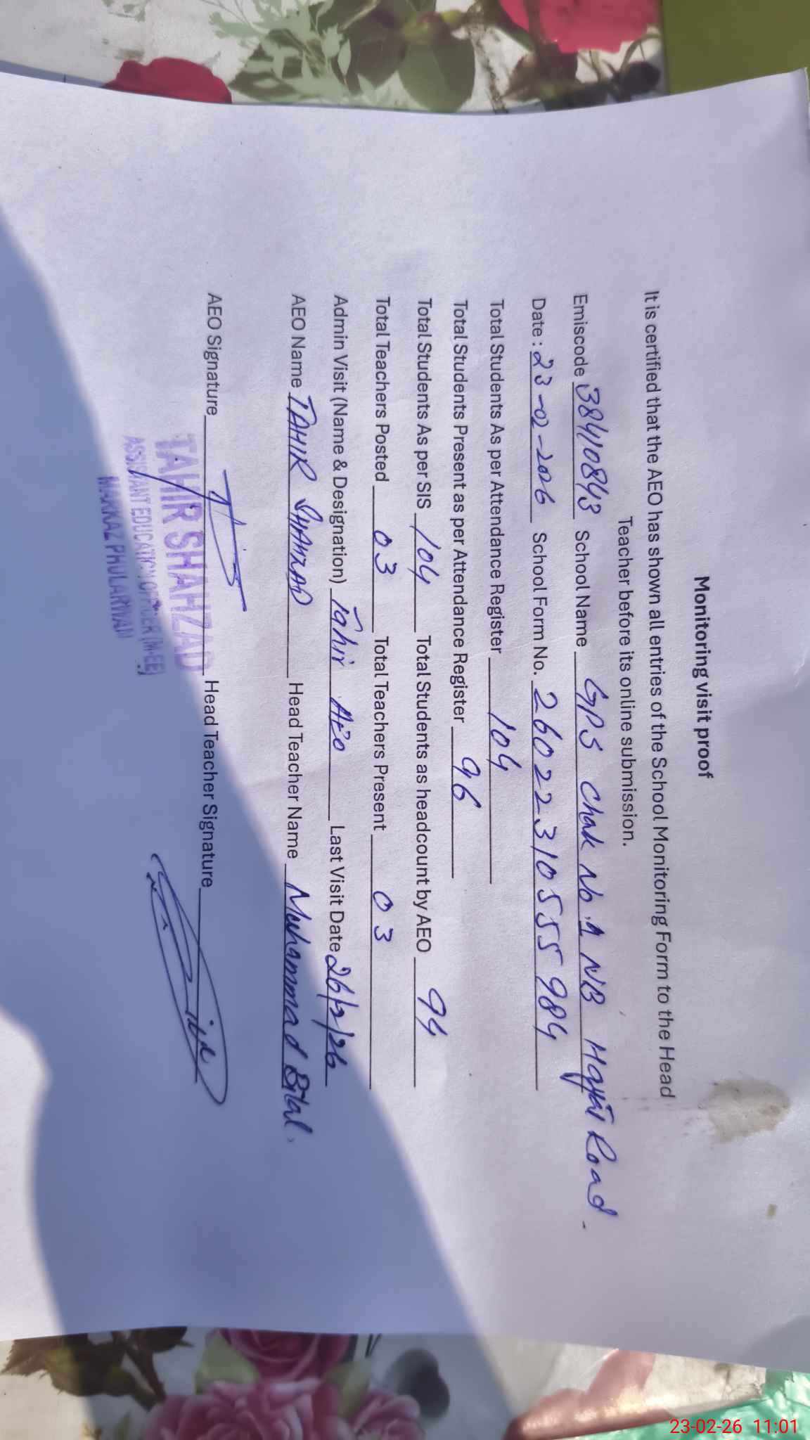 | EMIS Code: 38410843 | Name of School: GPS CHAK NO.1 NB HAYAT ROAD PHULARWAN | |||