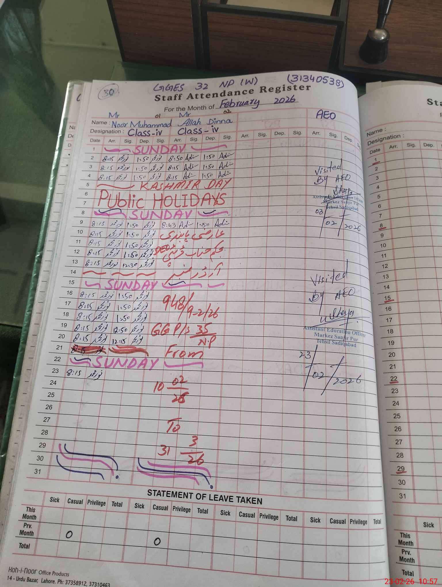 | Attendance Register | Head Teacher | MEA with School | Visit Proof |