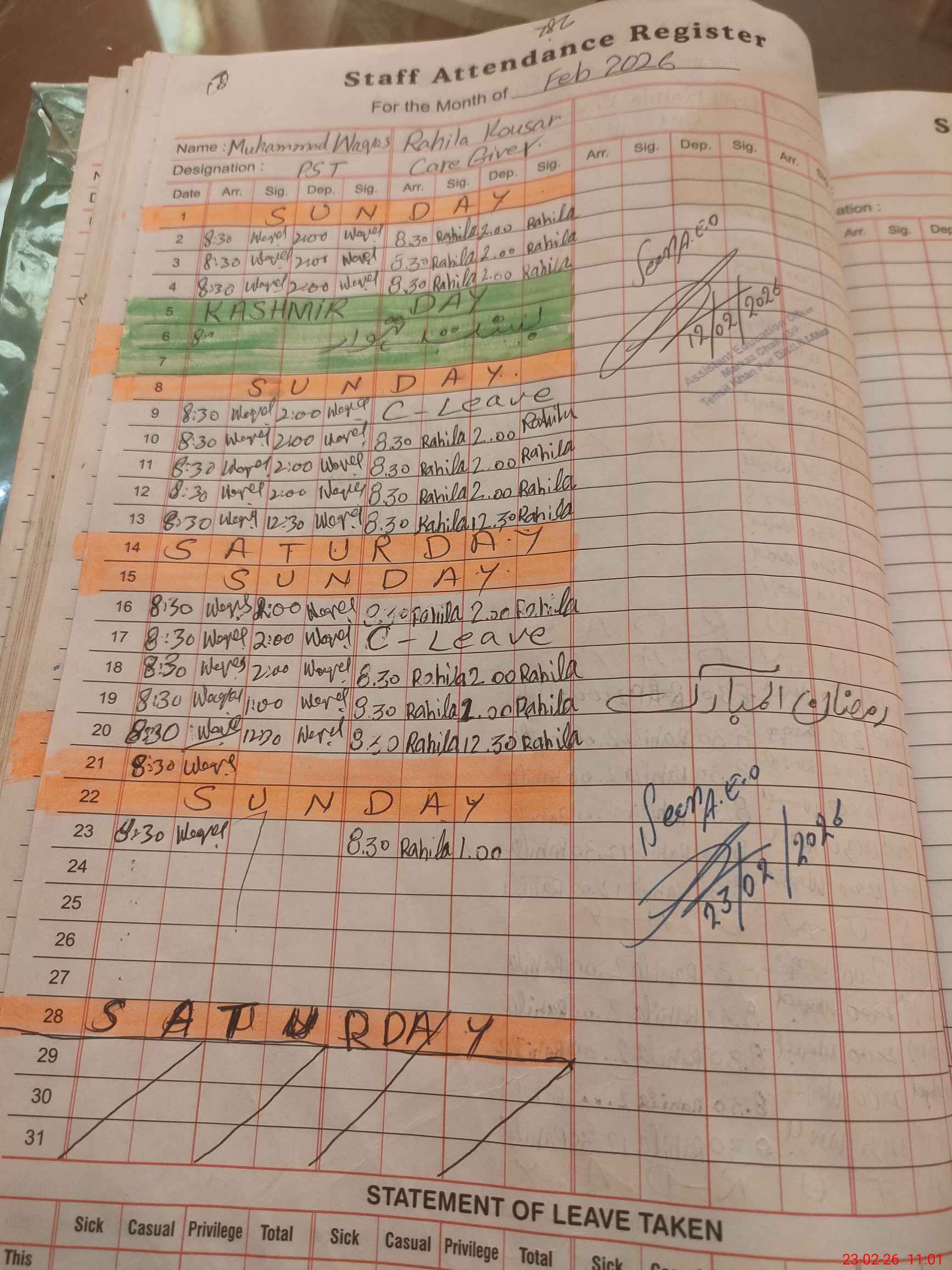 | CNIC | Full Name | Designation | R/C | Absence During Last Calender Month |