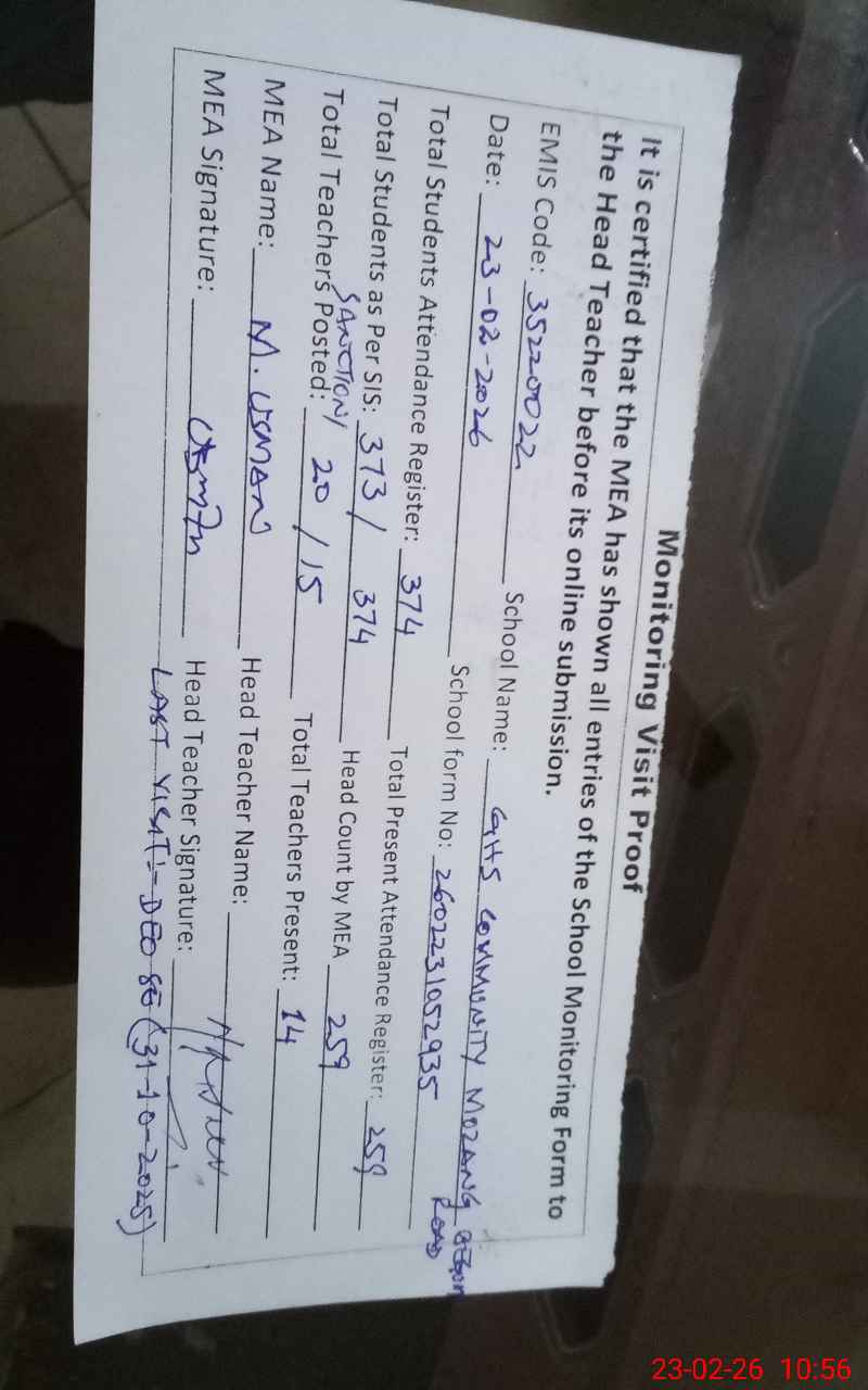 | EMIS Code: 35220022 | Name of School: GHS COMMUNITY MOZANG BEGUM ROAD | |||