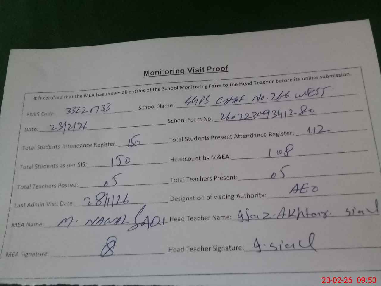 | Attendance Register | Head Teacher | MEA with School | Visit Proof |