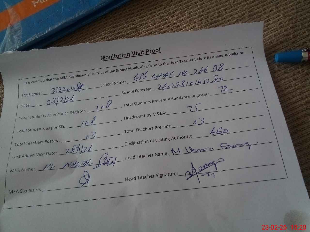| EMIS Code: 33220488 | Name of School: GPS CHAK NO. 266 JB | |||