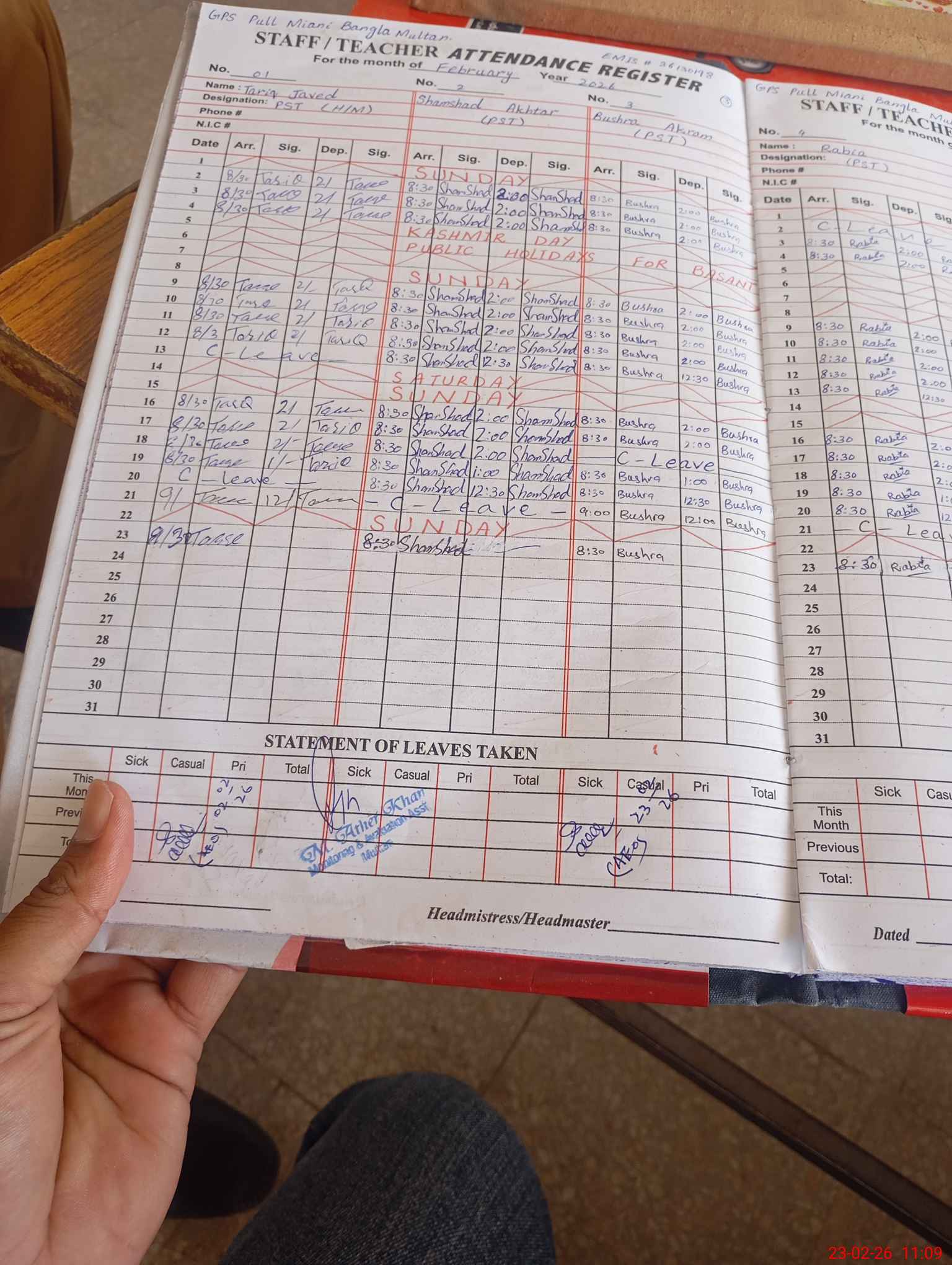 | Attendance Register | Head Teacher | MEA with School | Visit Proof |
