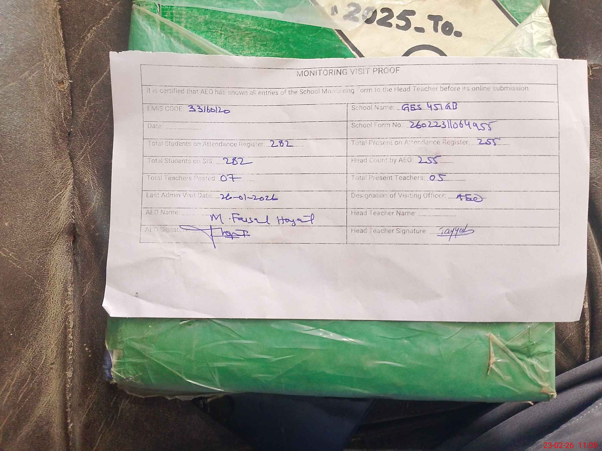 | EMIS Code: 33160120 | Name of School: GES CHAK NO 451 GB I TANDLIANWALA | |||