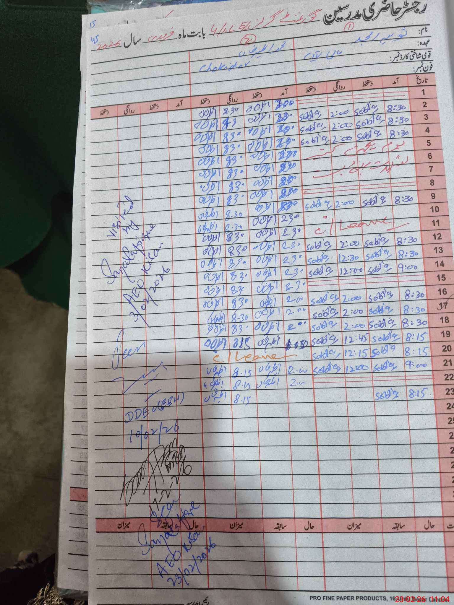 | CNIC | Full Name | Designation | R/C | Absence During Last Calender Month |