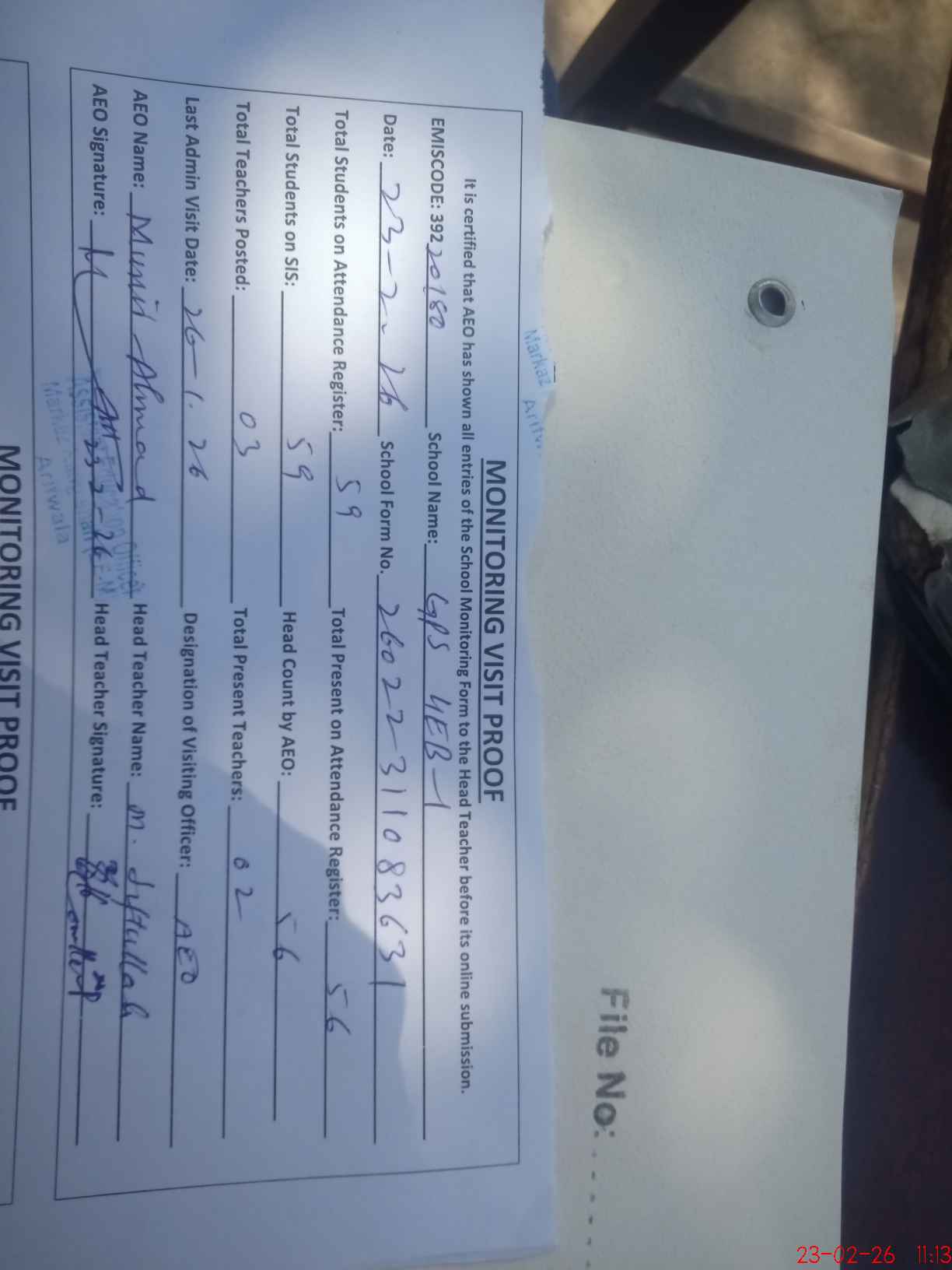 | Attendance Register | Head Teacher | MEA with School | Visit Proof |