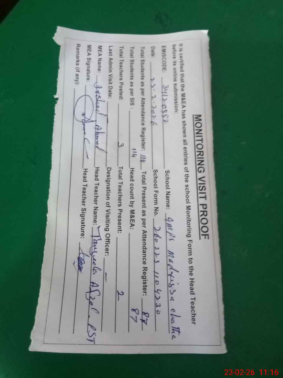 | Attendance Register | Head Teacher | MEA with School | Visit Proof |