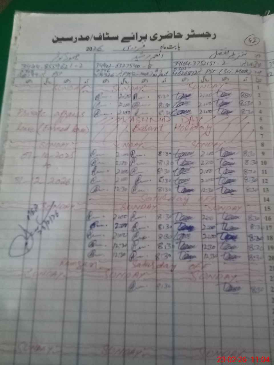 | CNIC | Full Name | Designation | R/C | Absence During Last Calender Month |