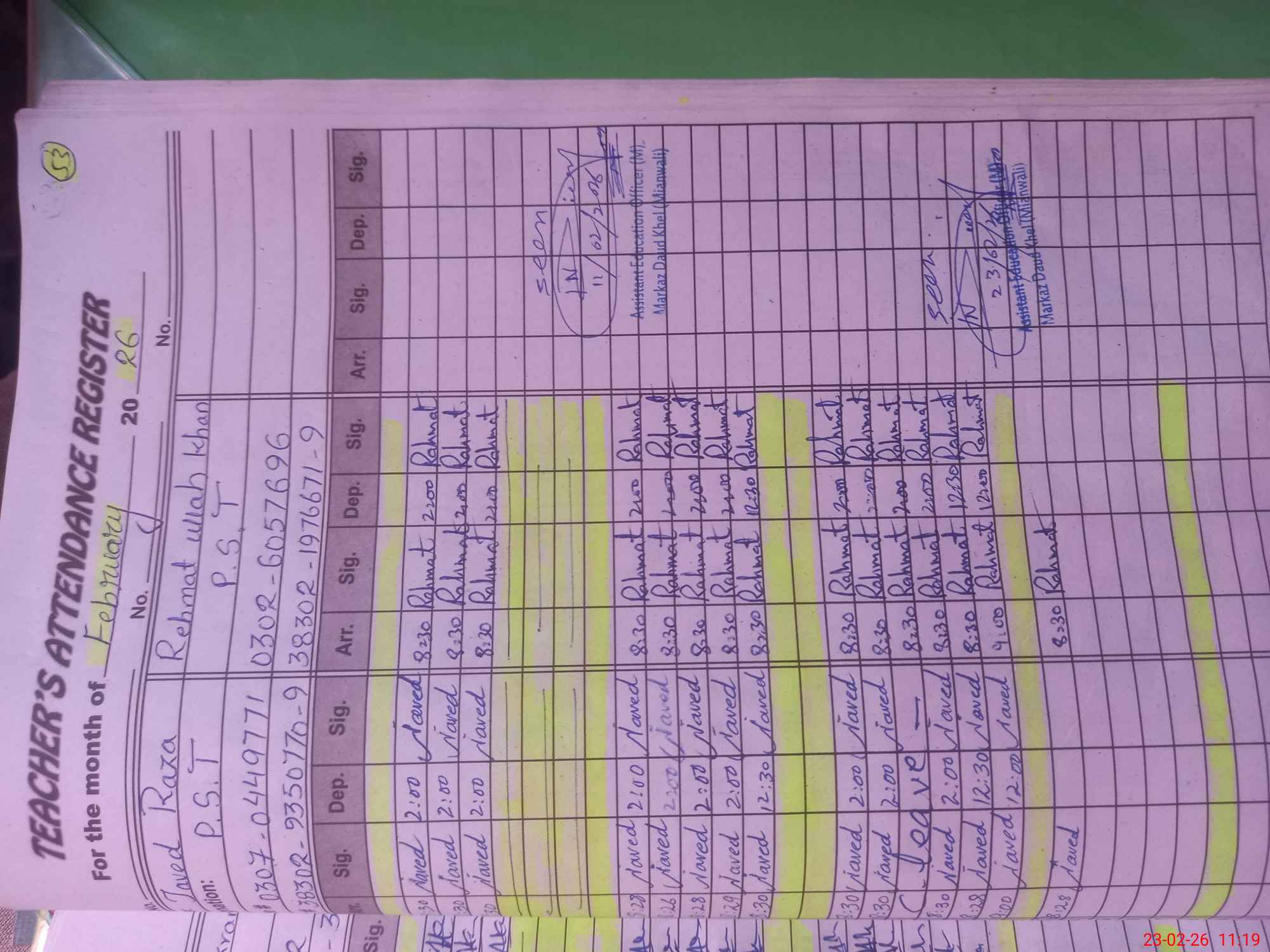 | Name: Mu**** Kh**** Designation: (School Headmaster's/Headmistress's) PST Phone/Cell Number: 03**** |