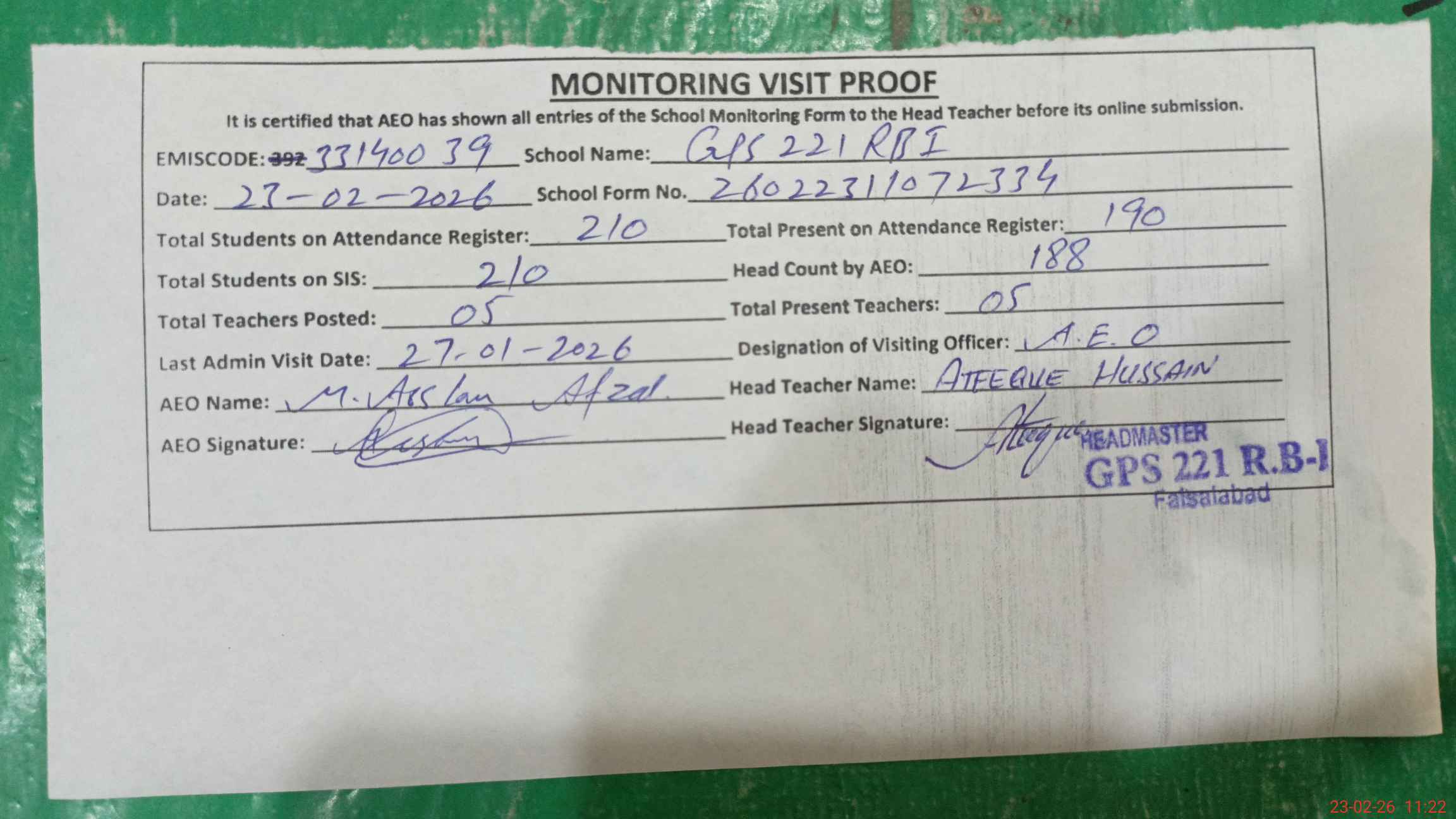 | Attendance Register | Head Teacher | MEA with School | Visit Proof |