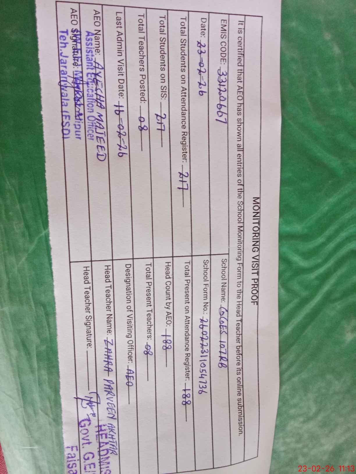 | Attendance Register | Head Teacher | MEA with School | Visit Proof |