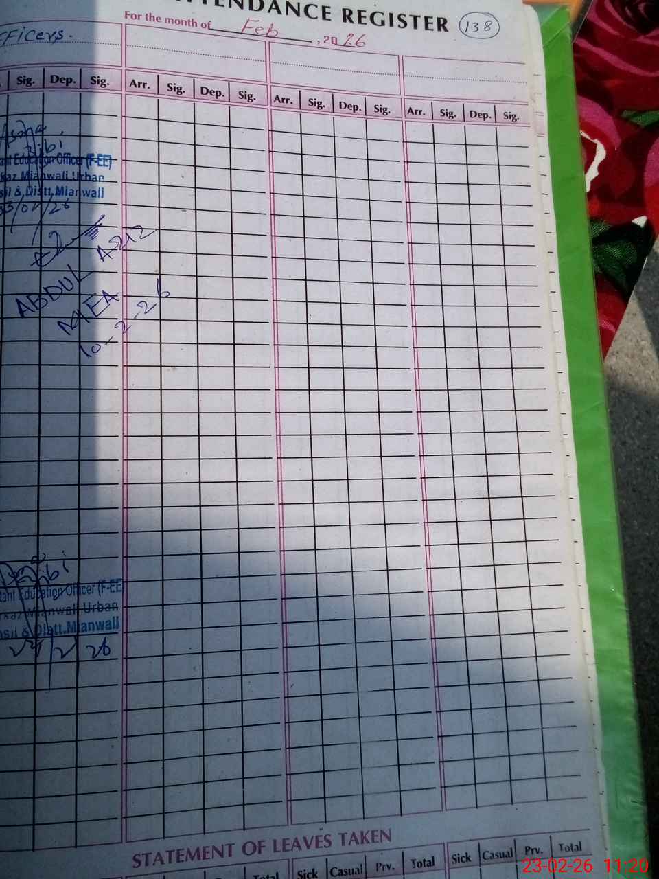 | CNIC | Full Name | Designation | R/C | Absence During Last Calender Month |