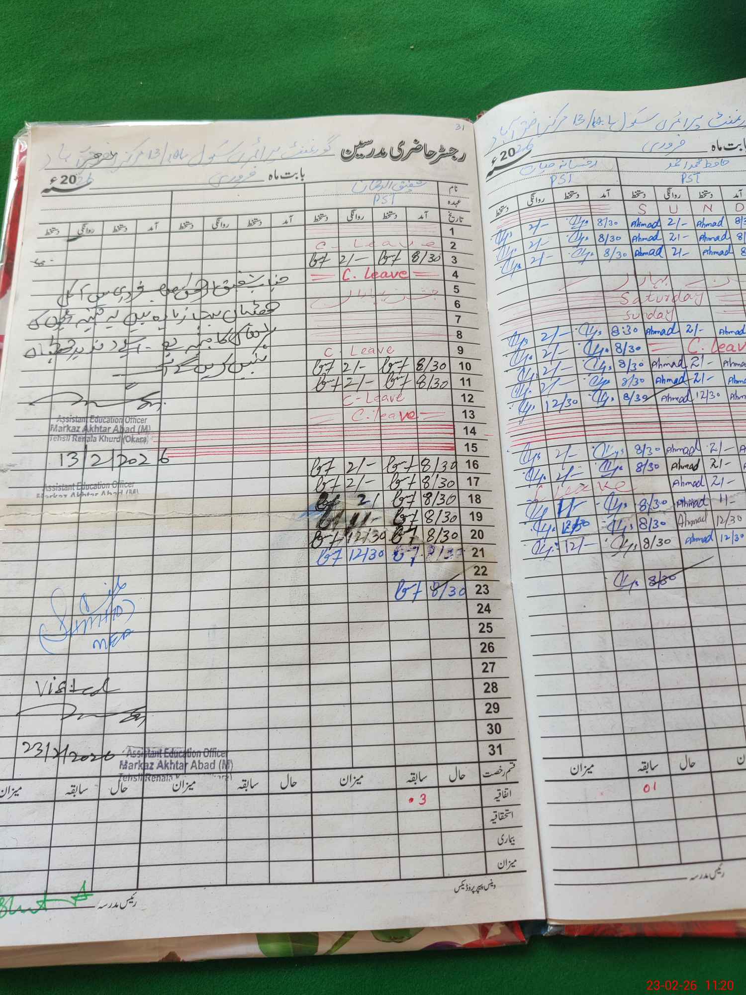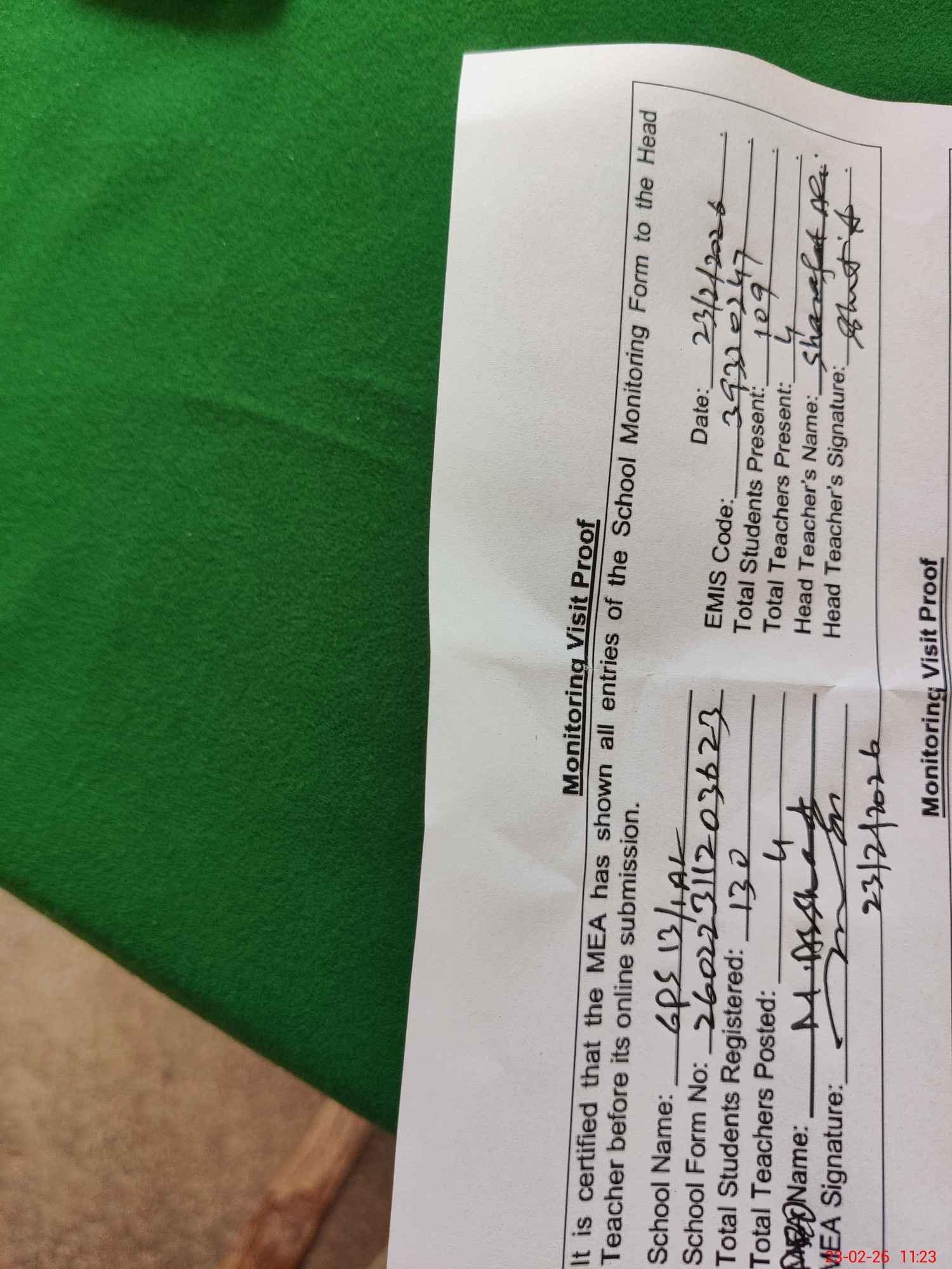 | Attendance Register | Head Teacher | MEA with School | Visit Proof |