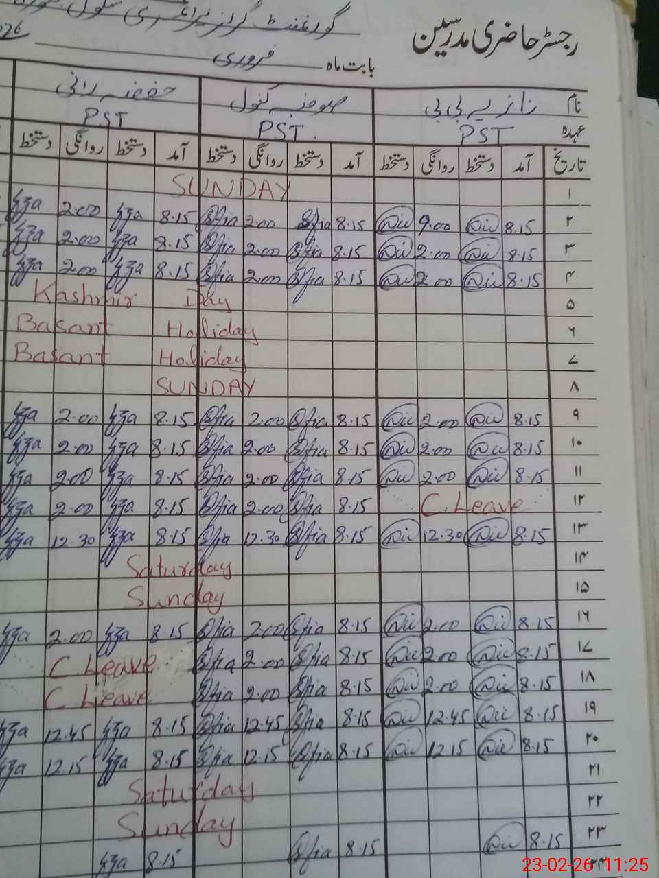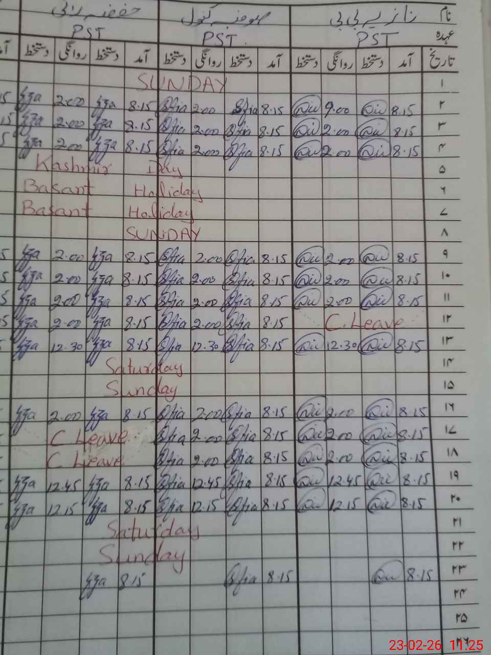 | CNIC | Full Name | Designation | R/C | Absence During Last Calender Month |