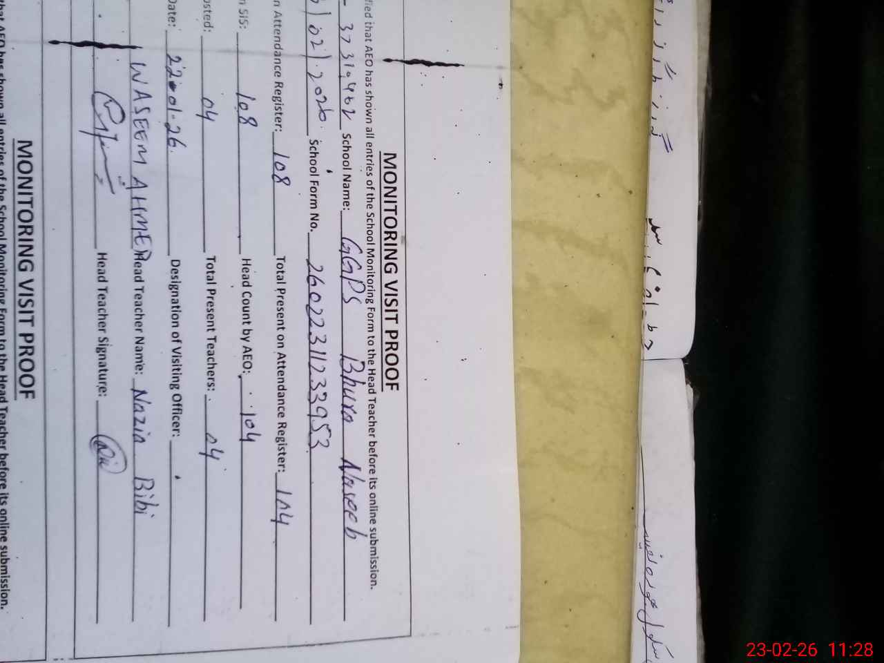| Attendance Register | Head Teacher | MEA with School | Visit Proof |
