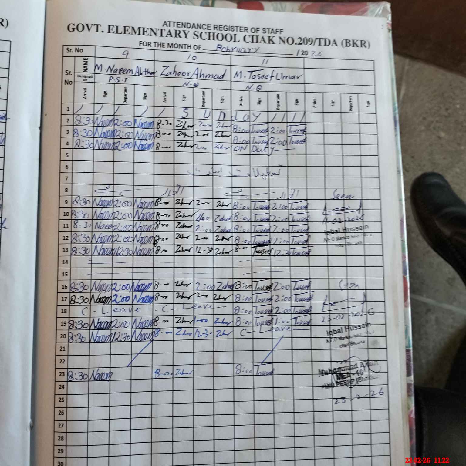 | CNIC | Full Name | Designation | R/C | Absence during last cal. month |