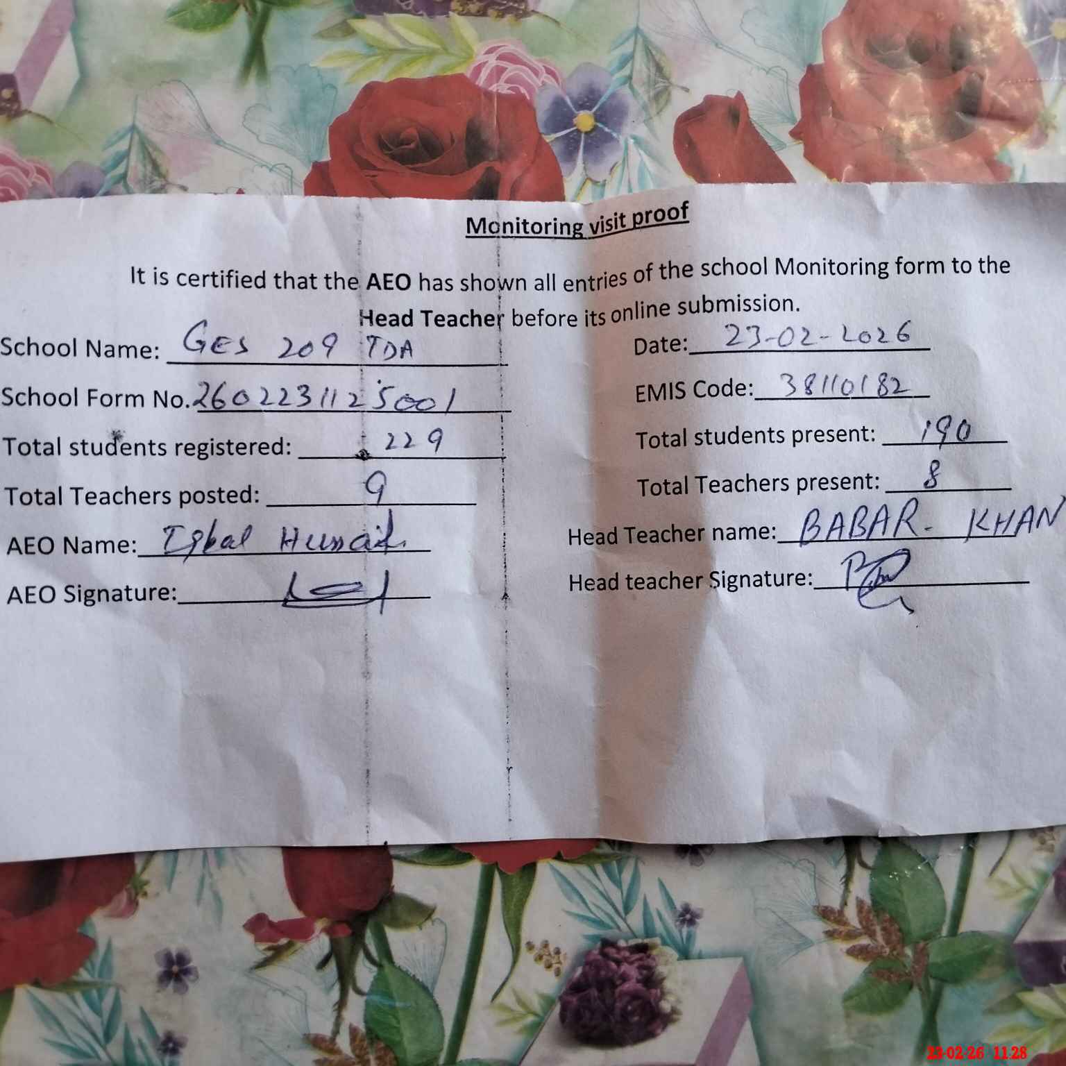 | Attendance Register | Head Teacher | MEA with School | Visit Proof |