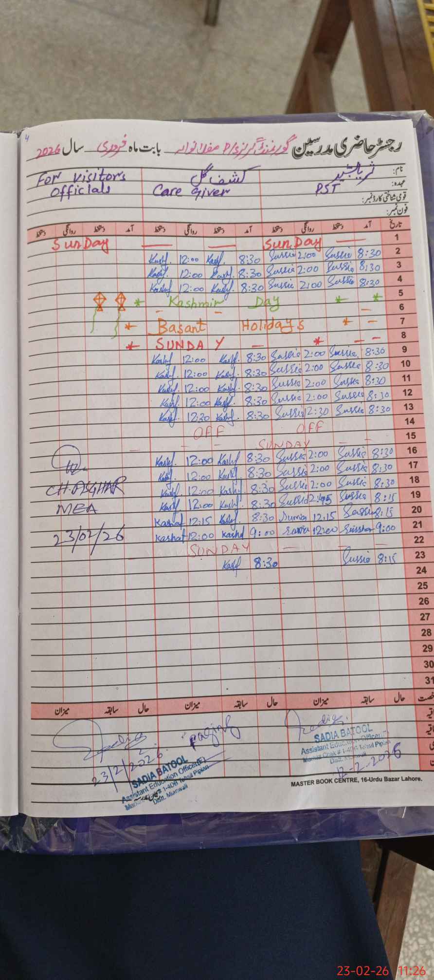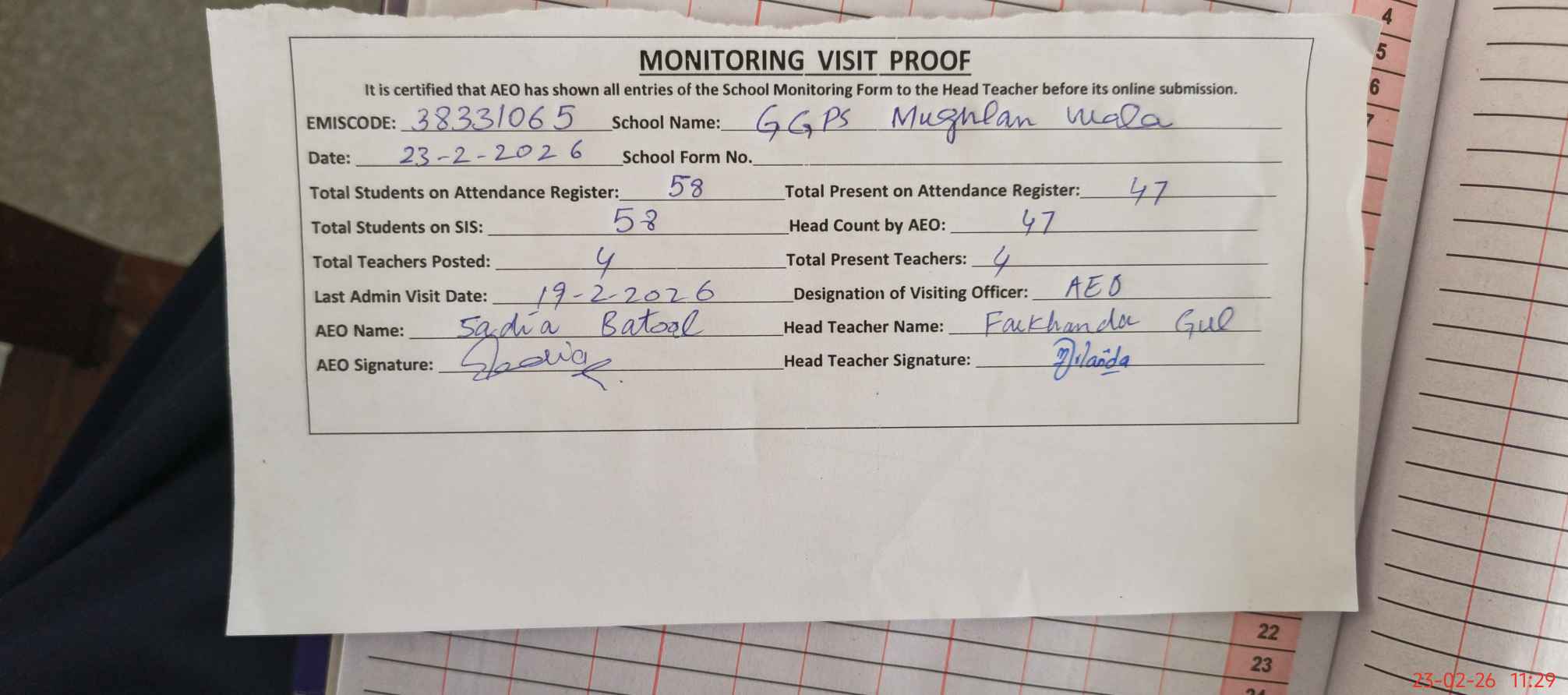 | Attendance Register | Head Teacher | MEA with School | Visit Proof |