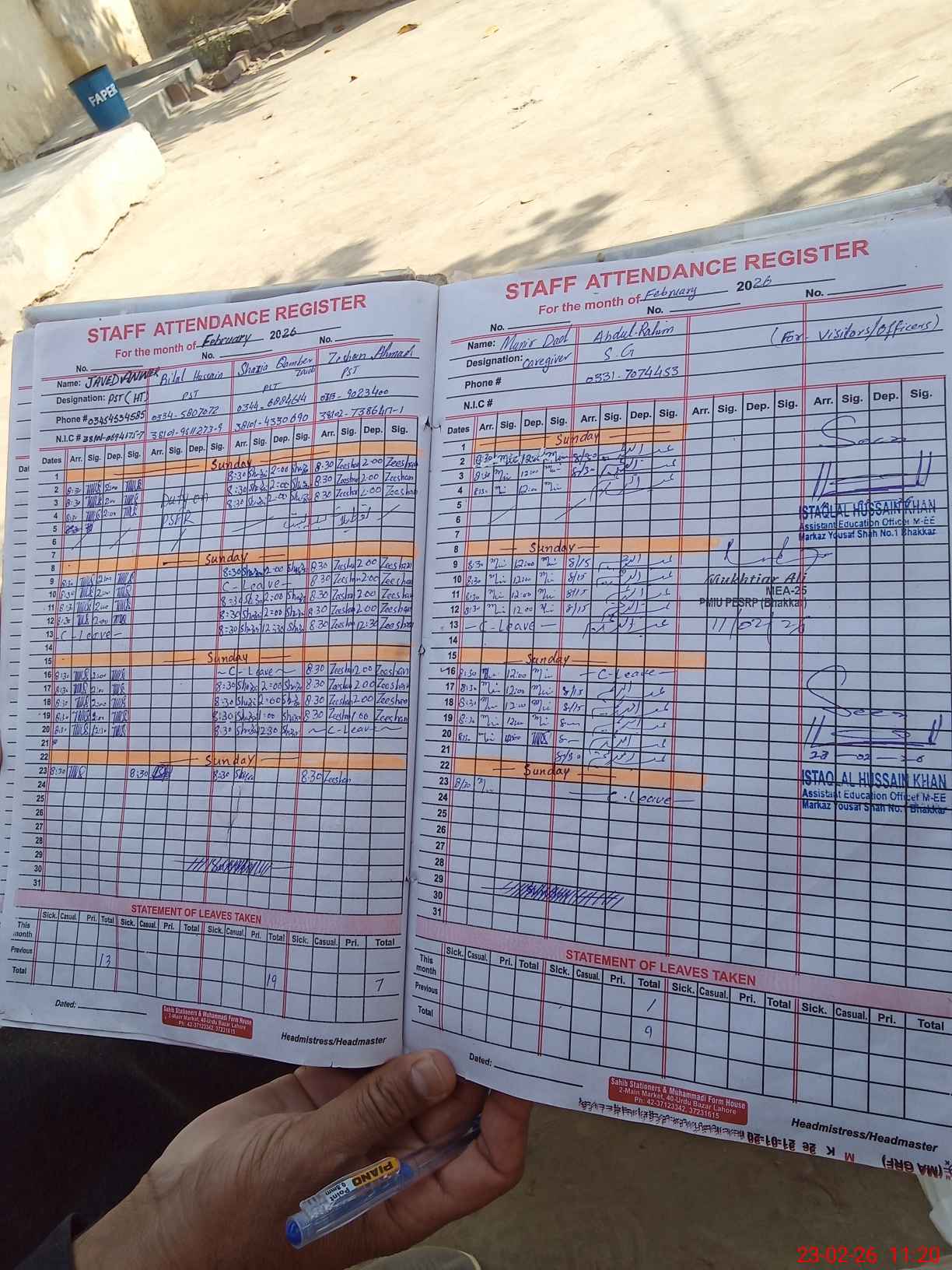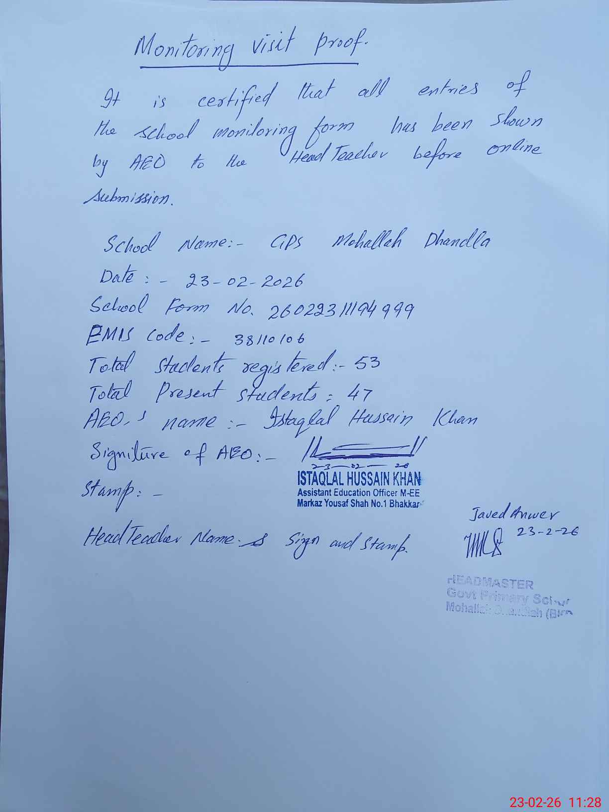 | Attendance Register | Head Teacher | MEA with School | Visit Proof |