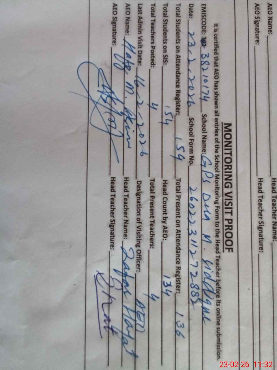 | Attendance Register | Head Teacher | MEA with School | Visit Proof |