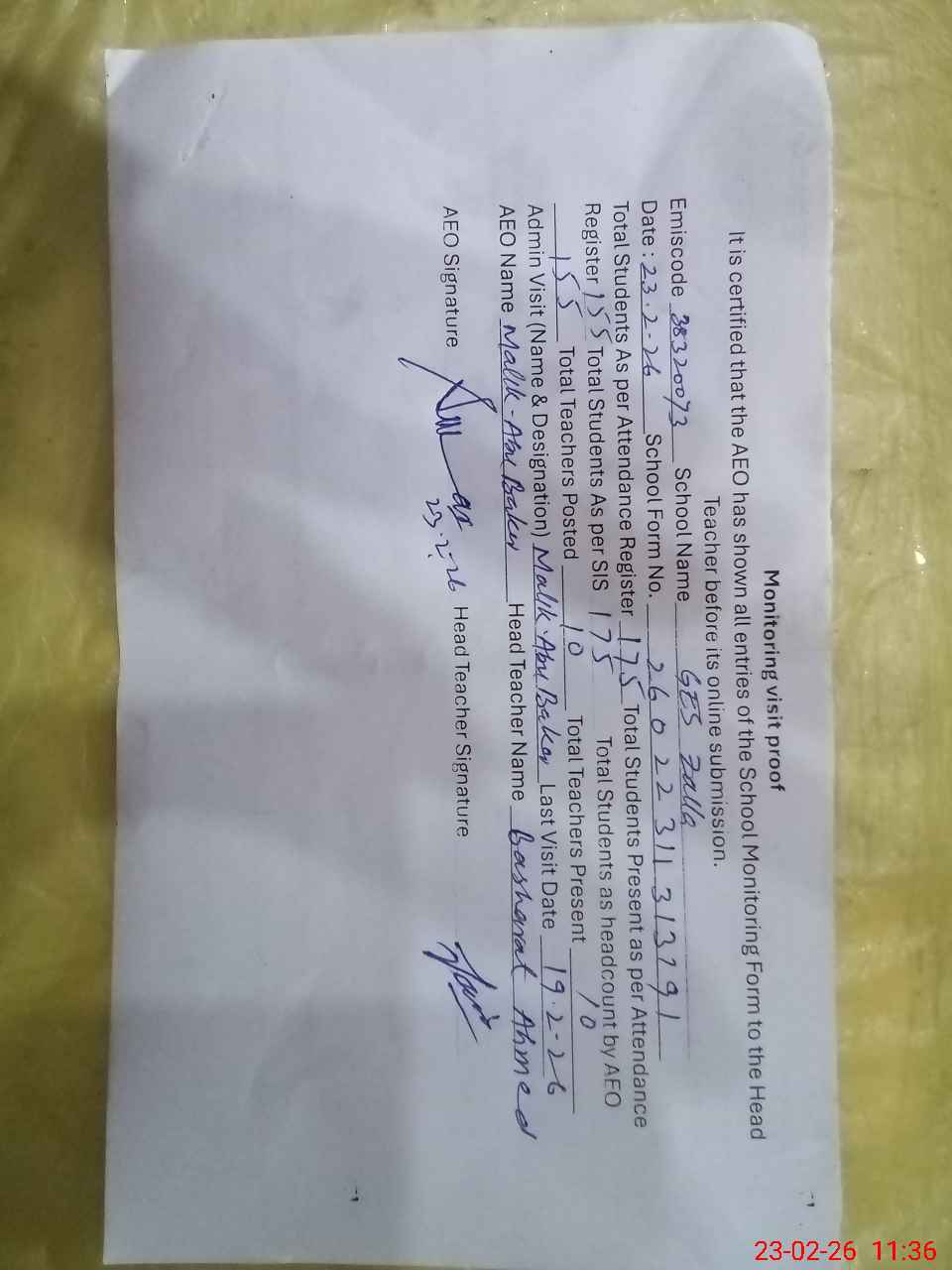 | Attendance Register | Head Teacher | MEA with School | Visit Proof |