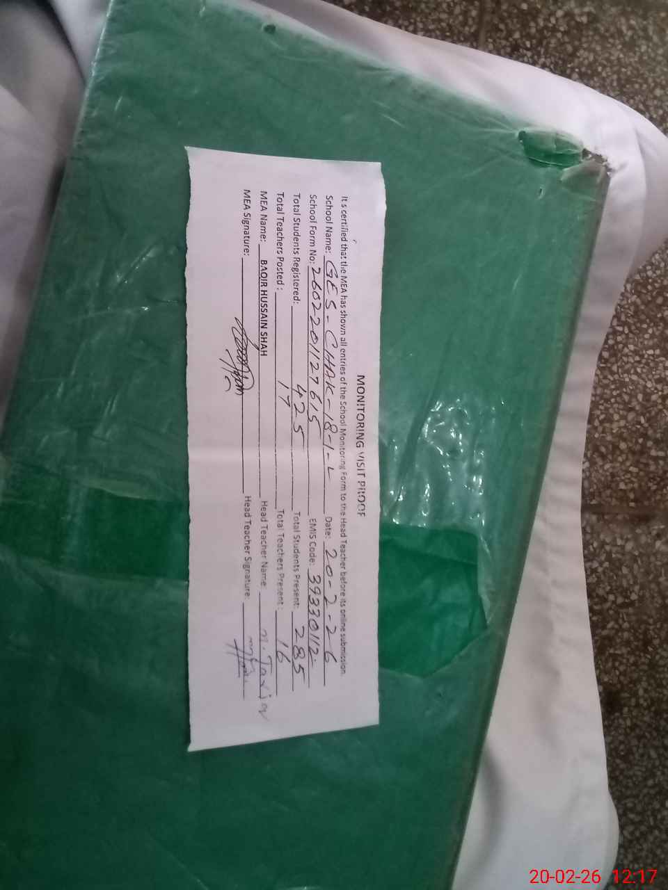 | Attendance Register | Head Teacher | MEA with School | Visit Proof |