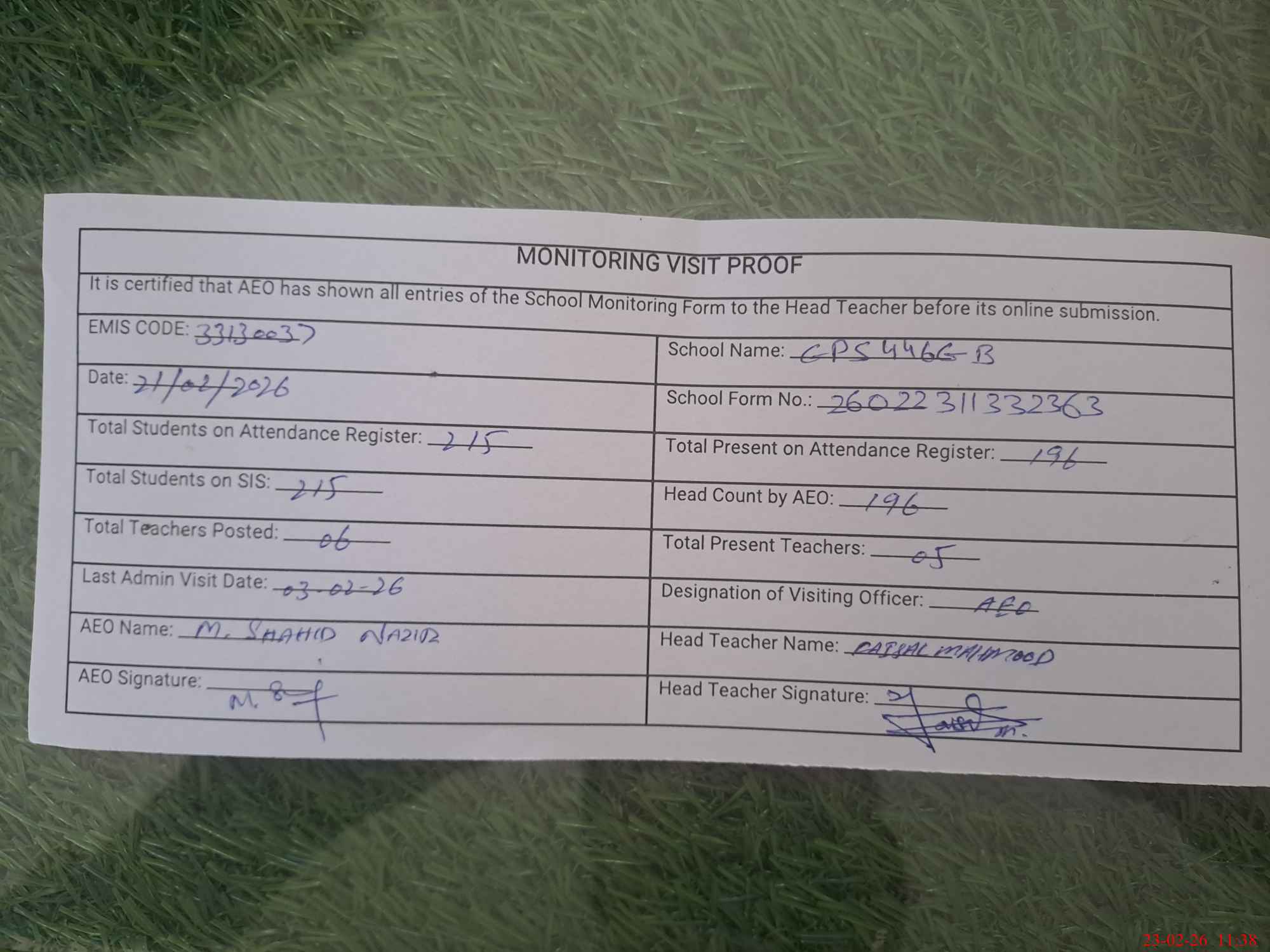 | Attendance Register | Head Teacher | MEA with School | Visit Proof |
