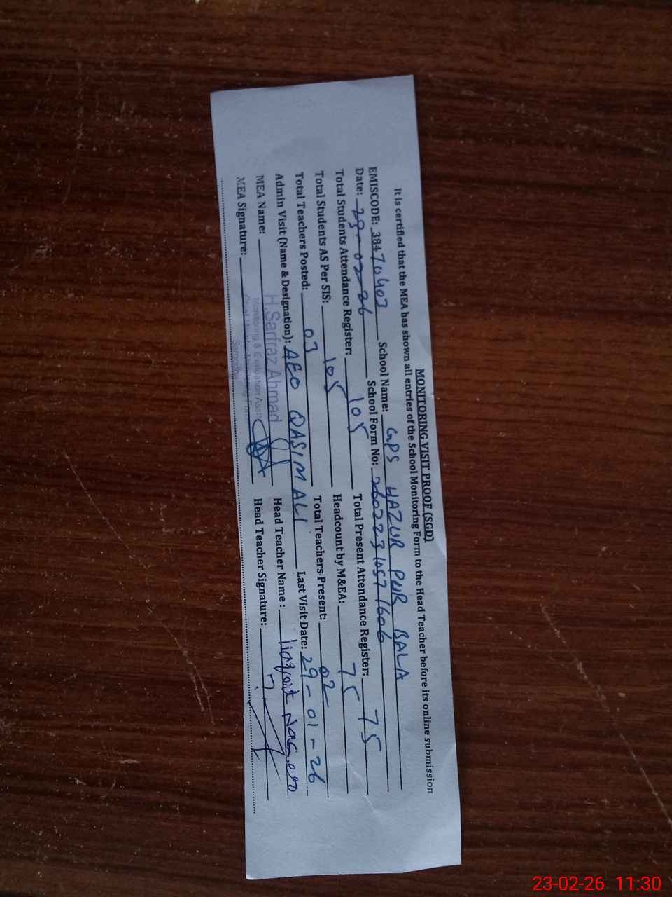 | Attendance Register | Head Teacher | MEA with School | Visit Proof |