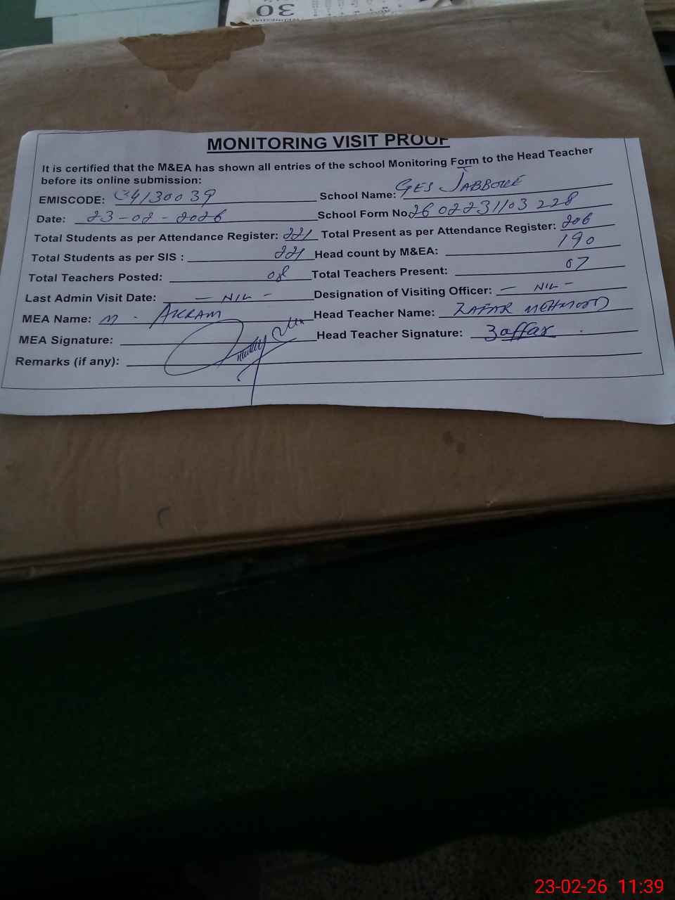 | Attendance Register | Head Teacher | MEA with School | Visit Proof |
