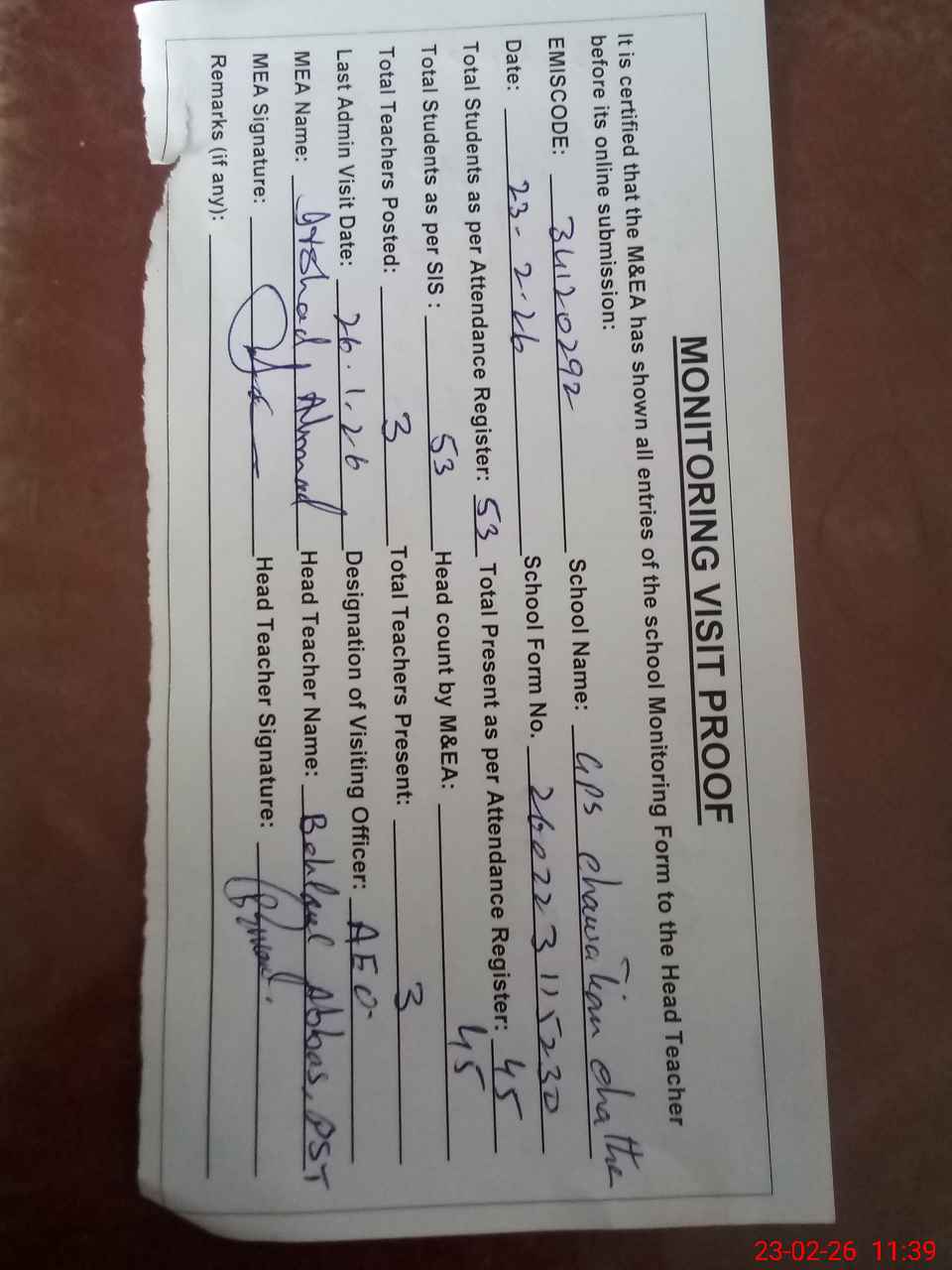 | EMIS Code: 34120292 | Name of School: GPS CHAWATIAN CHATHA | |||