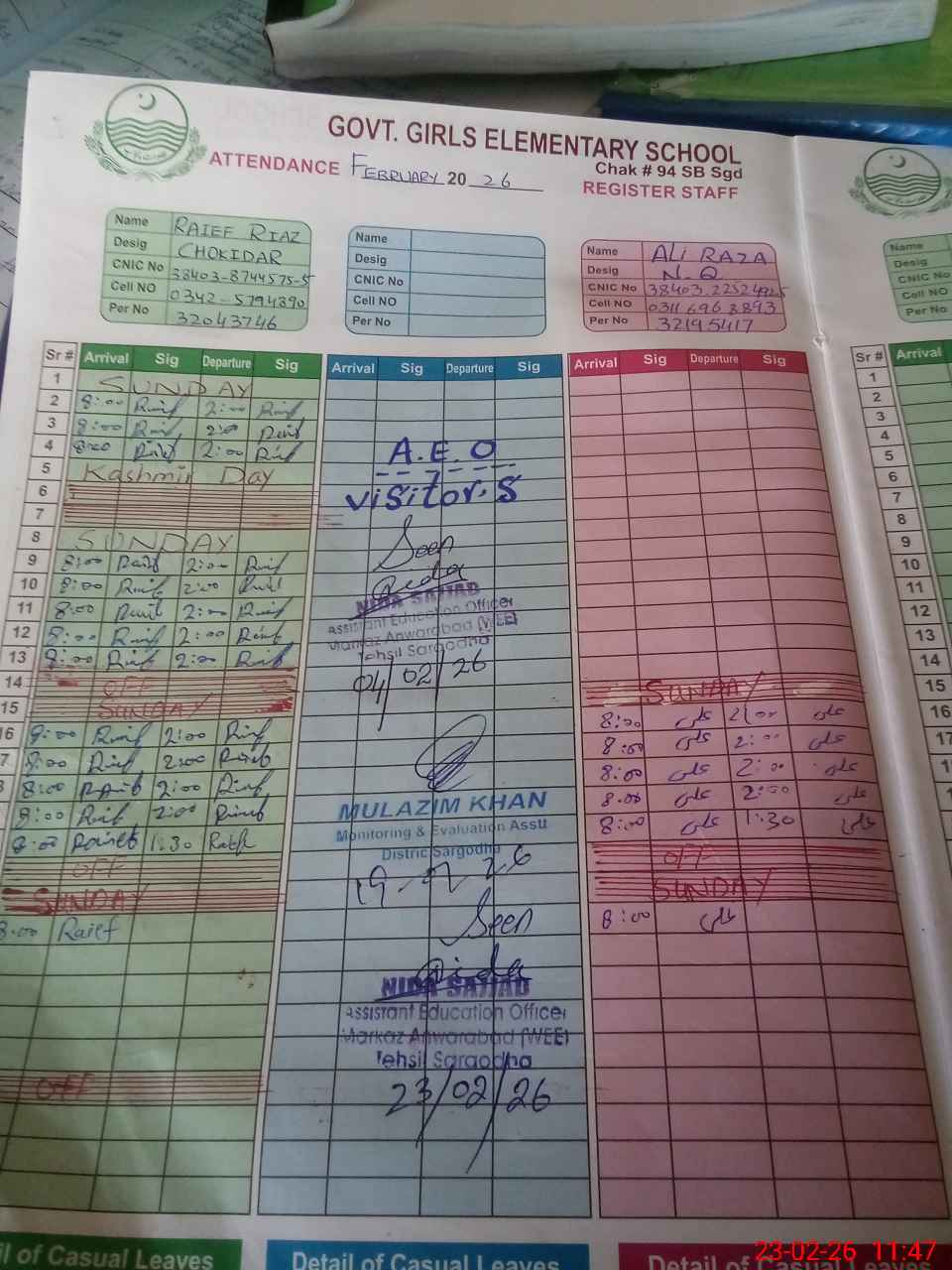 | CNIC | Full Name | Designation | R/C | Absence During Last Calender Month |